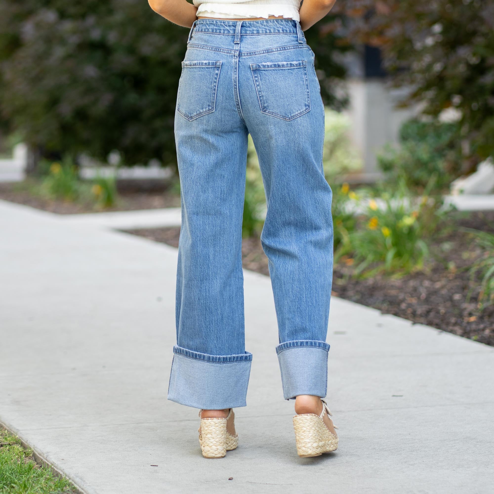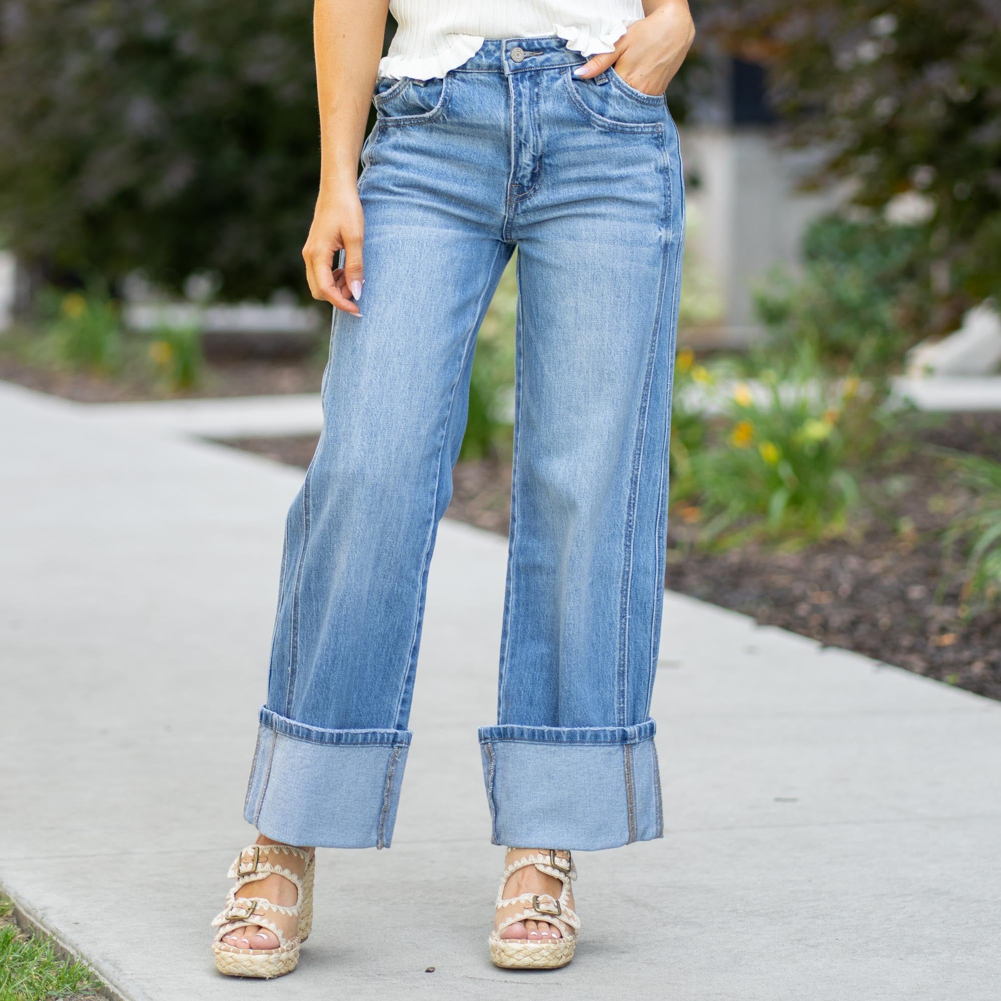 VERVET Dark Denim Super High Rise Cuffed Baggy Wide Leg Jeans Dark Blue Wash