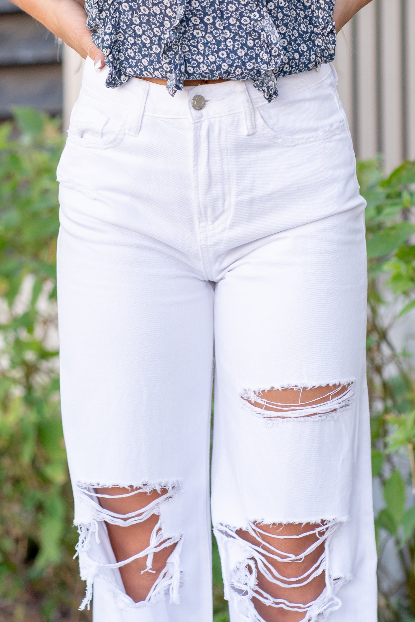 These jeans feature a high waist with a button fly and loose-fitted legs.