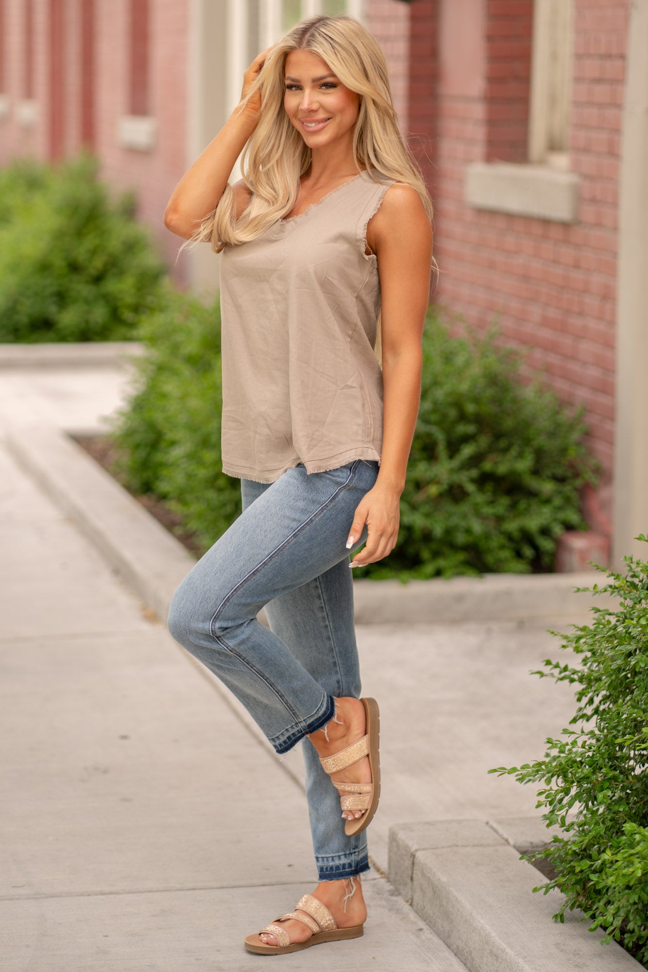 Linen Frayed V Neck Top - Lt Mocha
