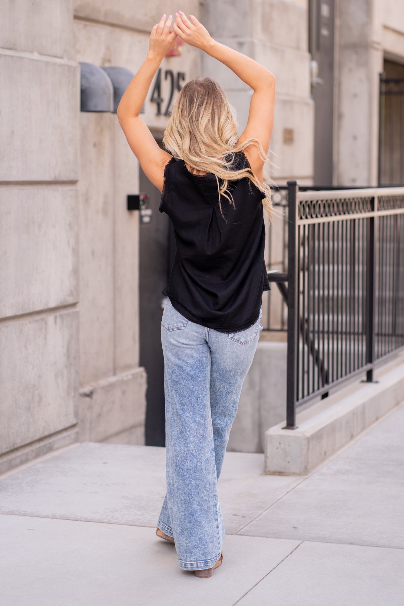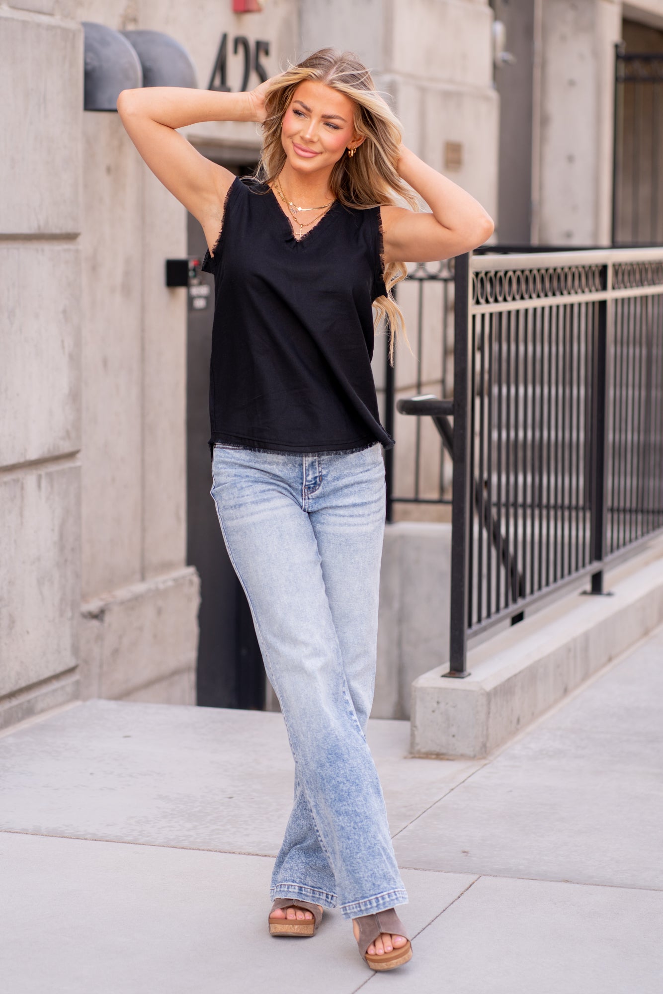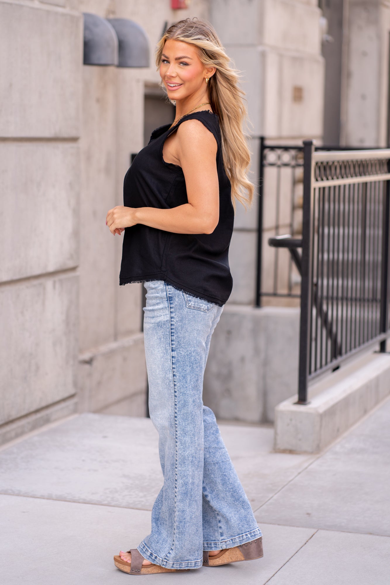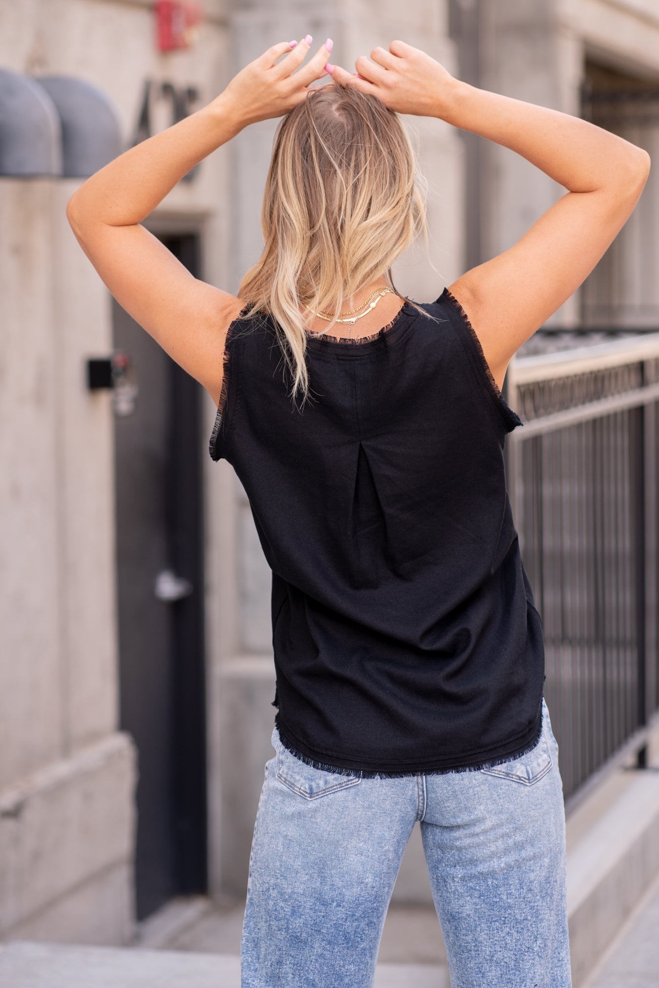 Linen Frayed V Neck Top - Black