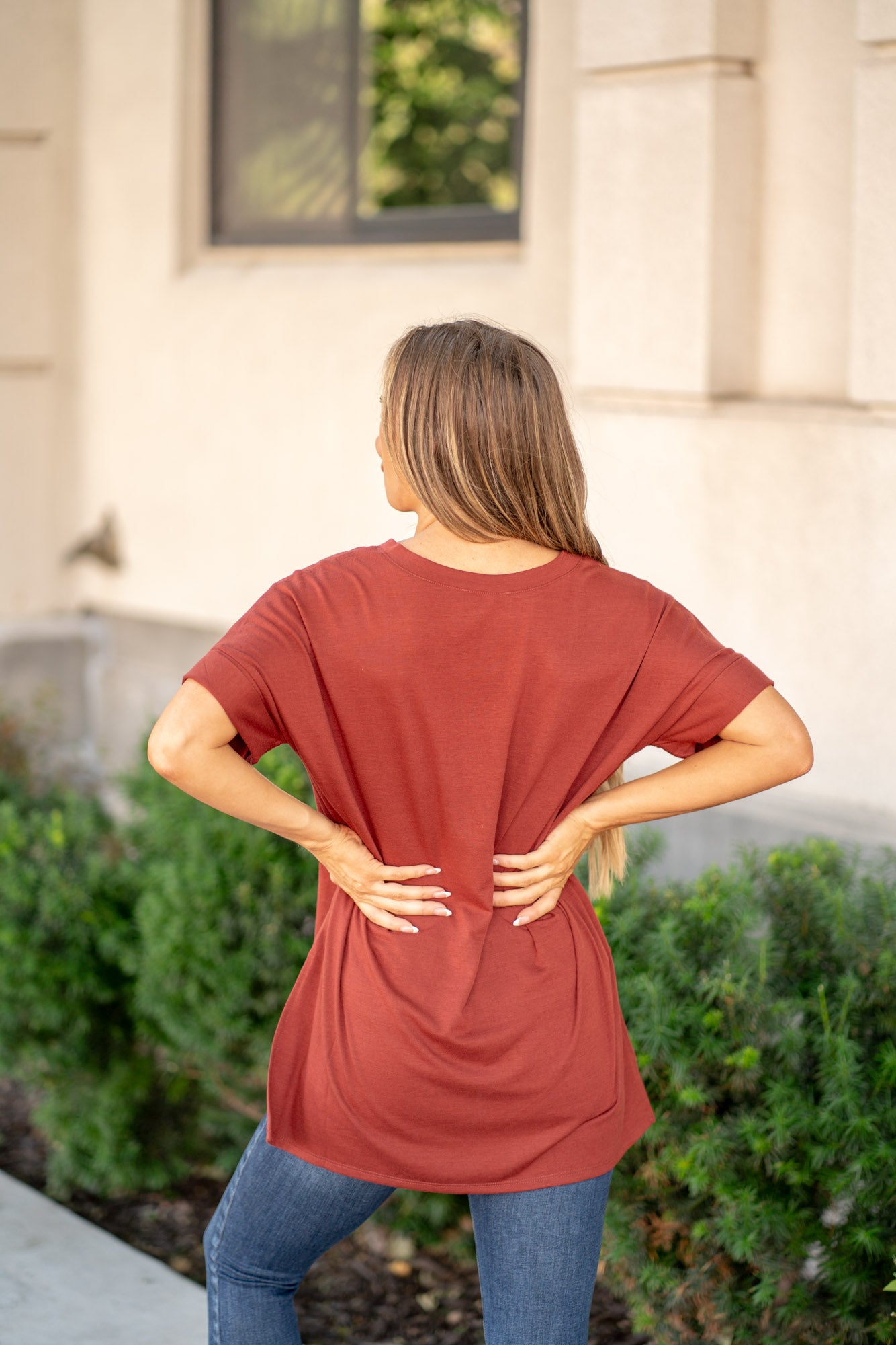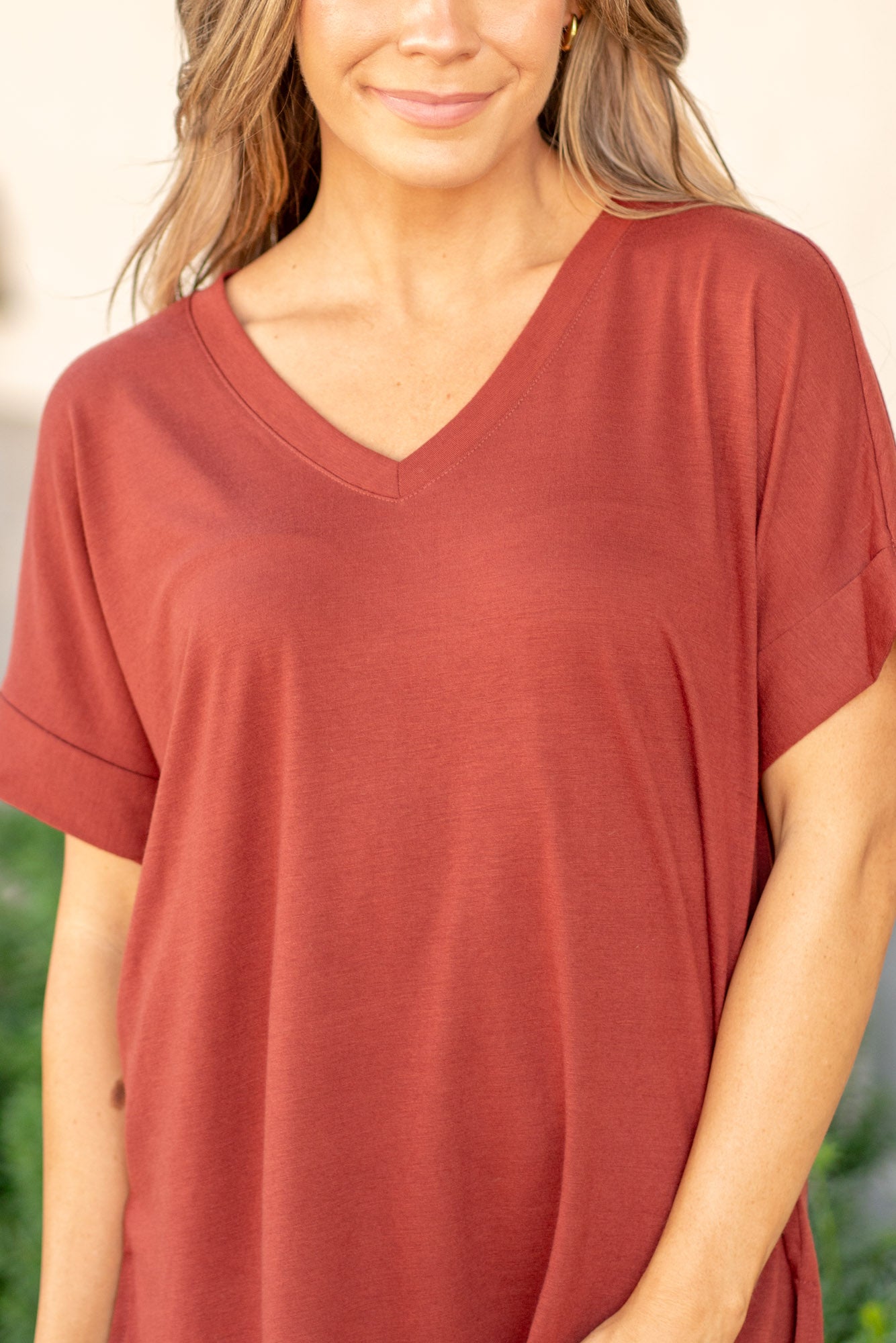 Super Soft High Low Hem V Neck Top - Dark Rust T-Shirt