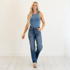 Crafted from soft, comfort-stretch denim, they offer all-day wearability while keeping their classic shape. The subtle fading and whiskering add a touch of vintage charm, while the full-length cut makes them easy to style with sneakers, heels, or ankle boots.