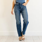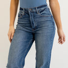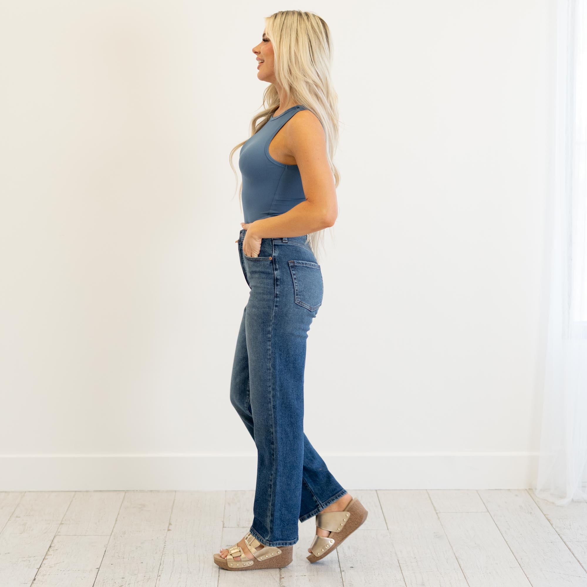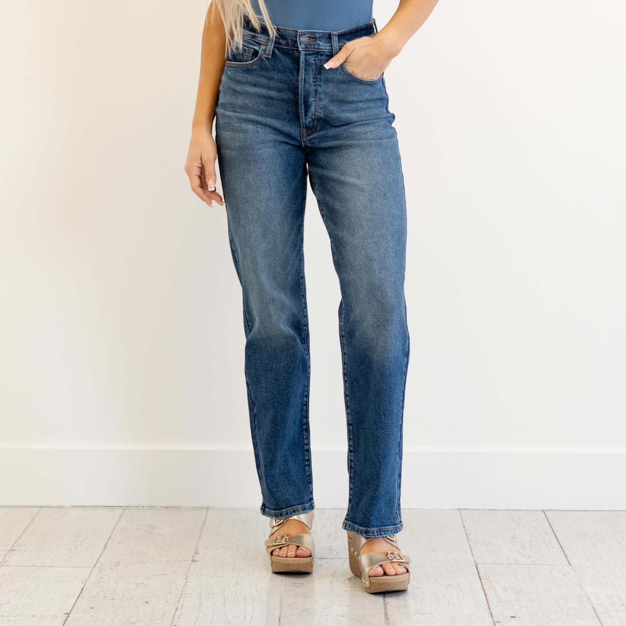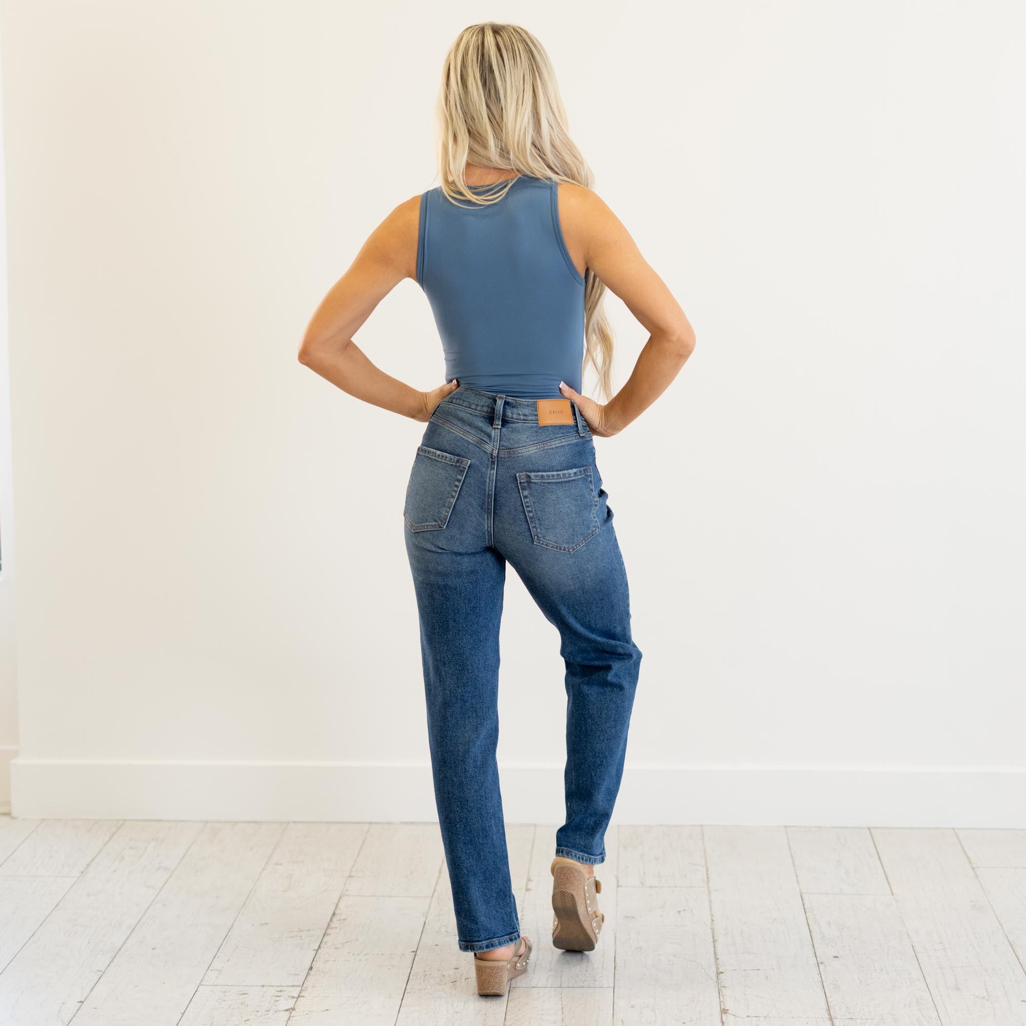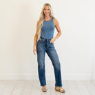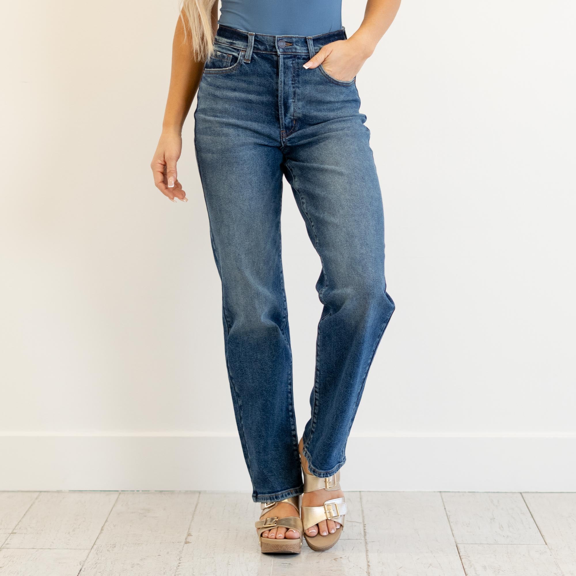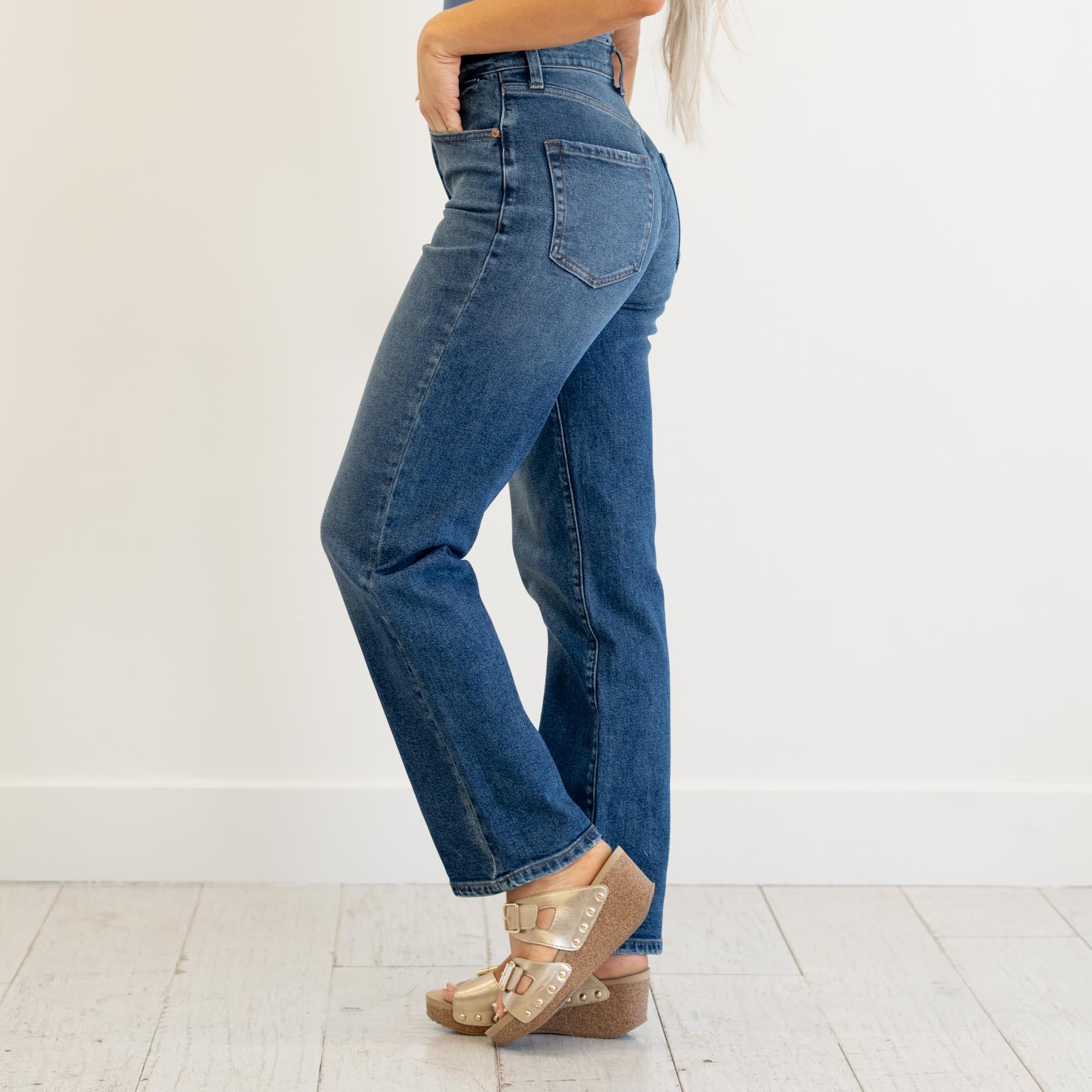 Cool, confident, and effortlessly laid-back — the Romy Super High Rise Dad Jeans bring a fresh update to a timeless fit. Designed in a rich dark blue wash, these jeans feature a structured silhouette that sits high on the waist and relaxes through the leg for that perfect “borrowed-from-the-boys” vibe.