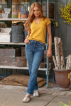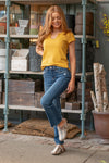 Sarah wears a size 25 in jeans, a small in tops, and 8 in shoes. She is wearing size 25 in these jeans.