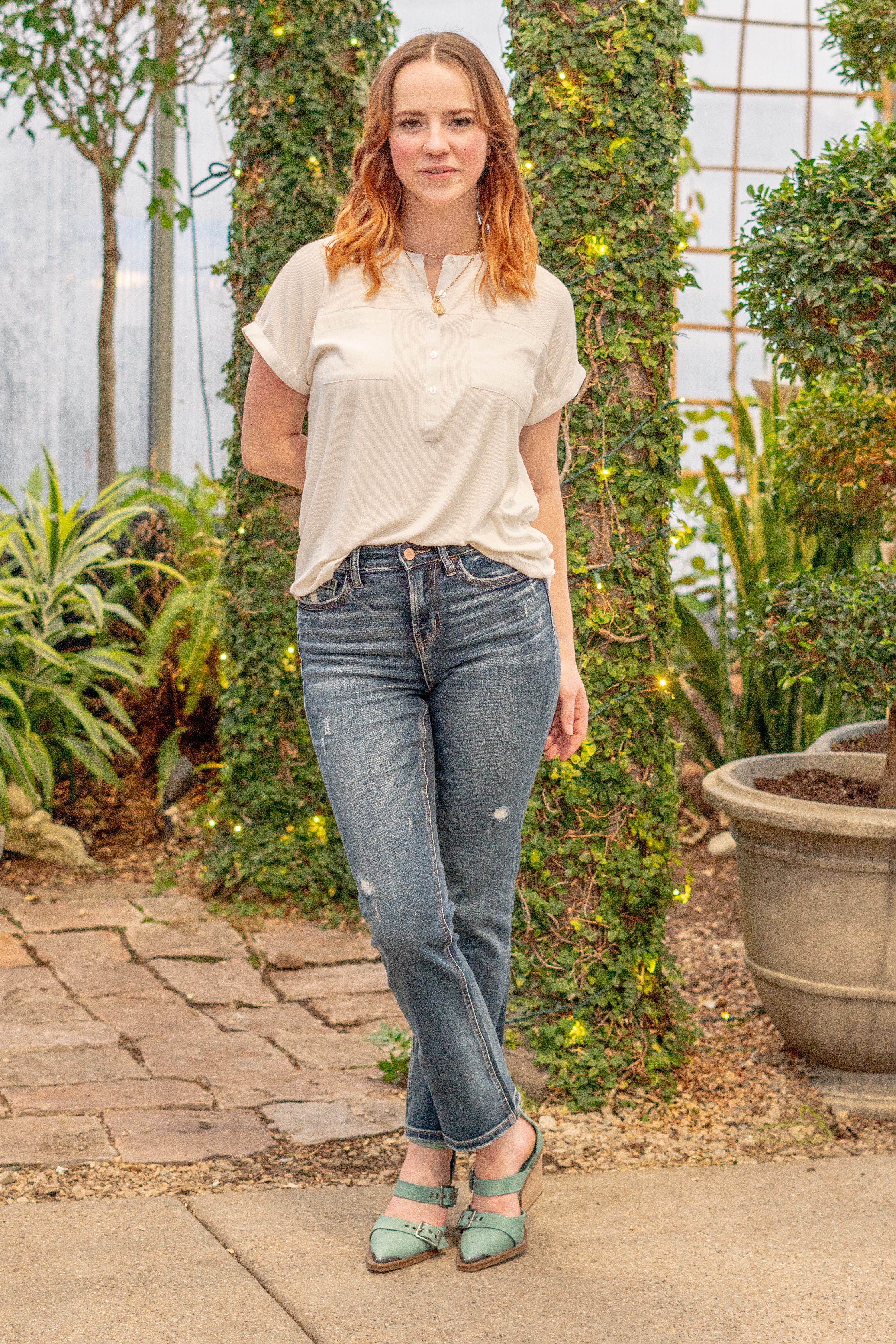 Discover elevated comfort and style with our High Rise Ankle Slim Straight Jeans. Crafted from comfort stretch denim, these jeans feature a high-rise waist, subtle distressed detailing, and ankle length for a modern look. Step into effortless sophistication with our straight jeans.