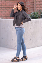 This moto black wash denim jacket offers timeless style with added comfort, thanks to its stretch fabric. It's a versatile wardrobe staple, perfect for layering over various outfits and providing ease of movement.