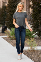 Cas is 5'7" and wears a size 25 in jeans, a small in tops, and 8 in shoes. She is wearing size 25 in these jeans.