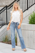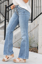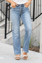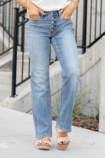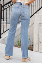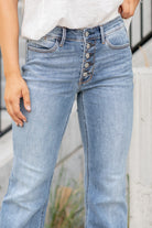 These mid-rise jeans showcase a trendy bootcut silhouette with a stylish button fly. The mid-rise waistline offers a comfortable fit and a flattering shape. With their versatile design, these jeans can be dressed up or down for various occasions.