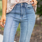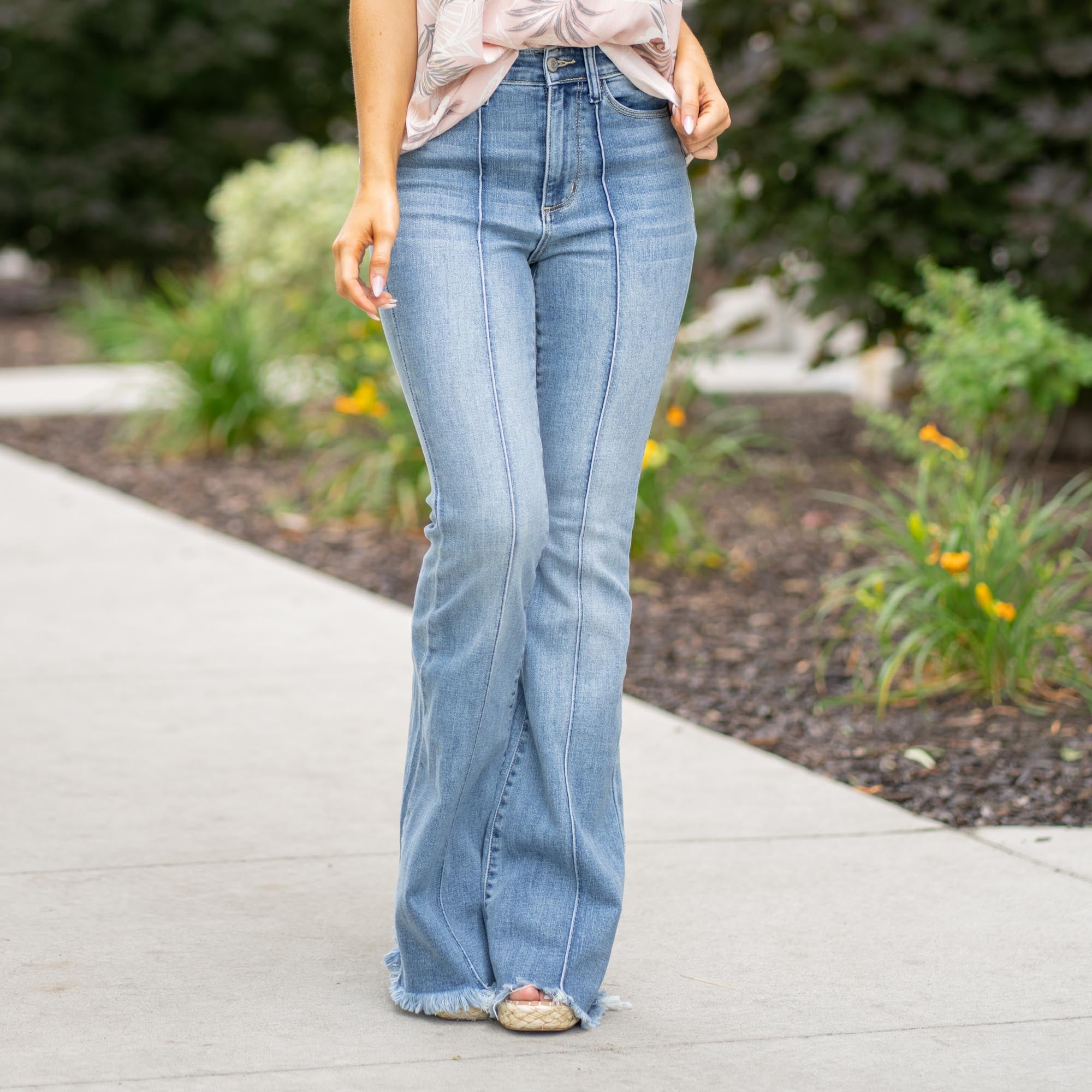 The Starlit Flare Jean adds dramatic flair to your denim lineup with front pintuck seams that elongate the legs and a frayed hem that keeps it cool and casual. Designed with a flattering high-rise waist and crafted in Judy Blue’s signature comfort stretch denim, this pair hugs your curves and moves with you. Finished with a zip fly, five-pocket design, and a flared silhouette made for standout style—this is the jean you’ll reach for when you want to feel effortlessly iconic.