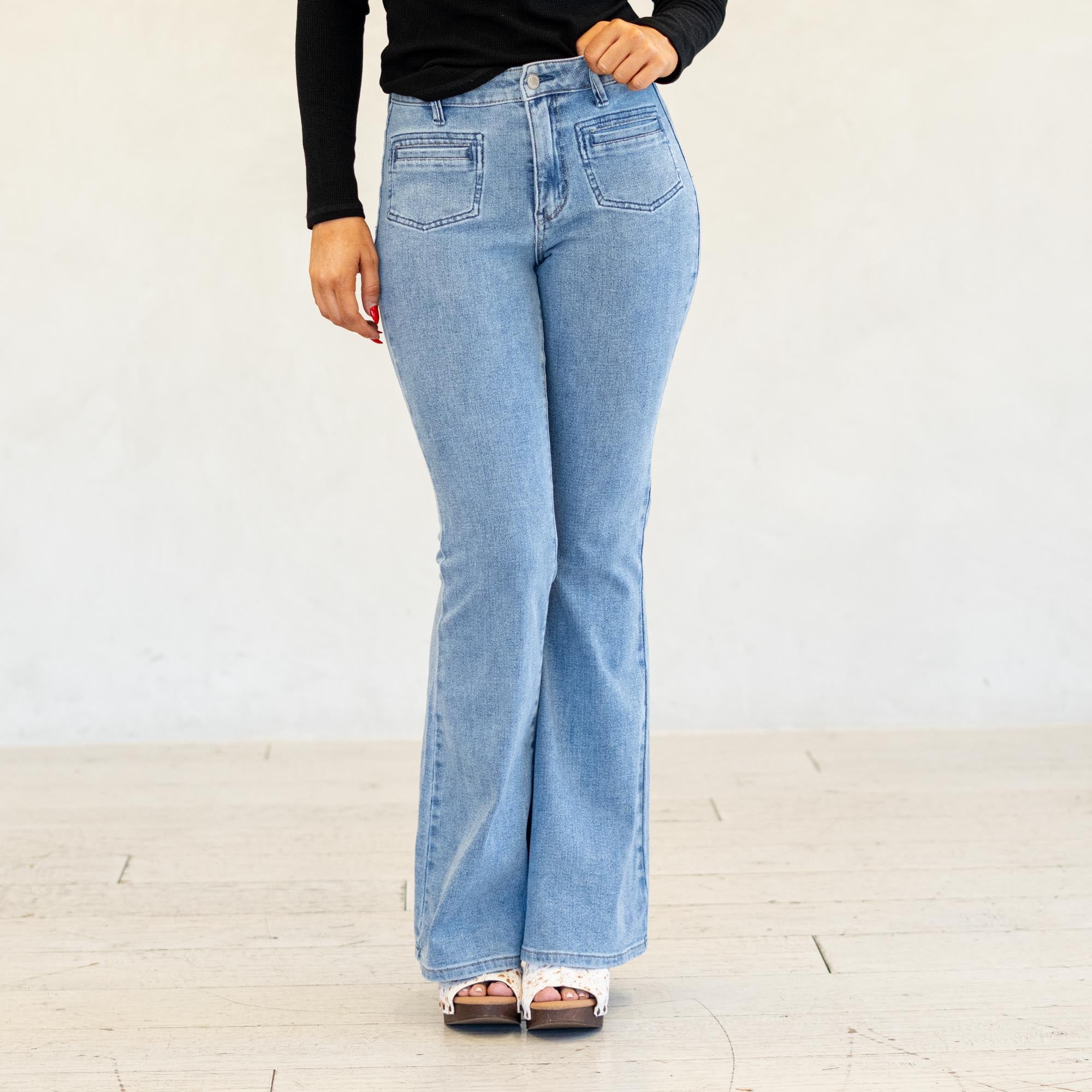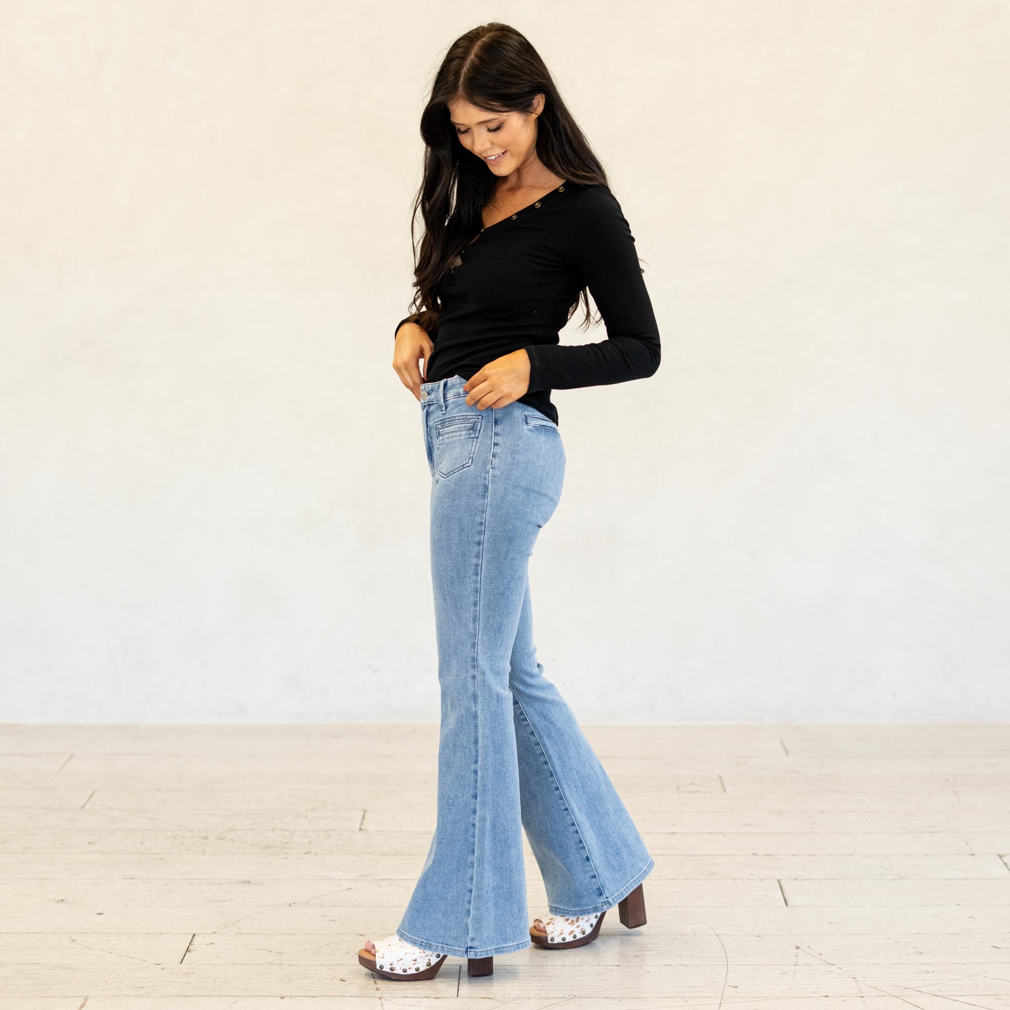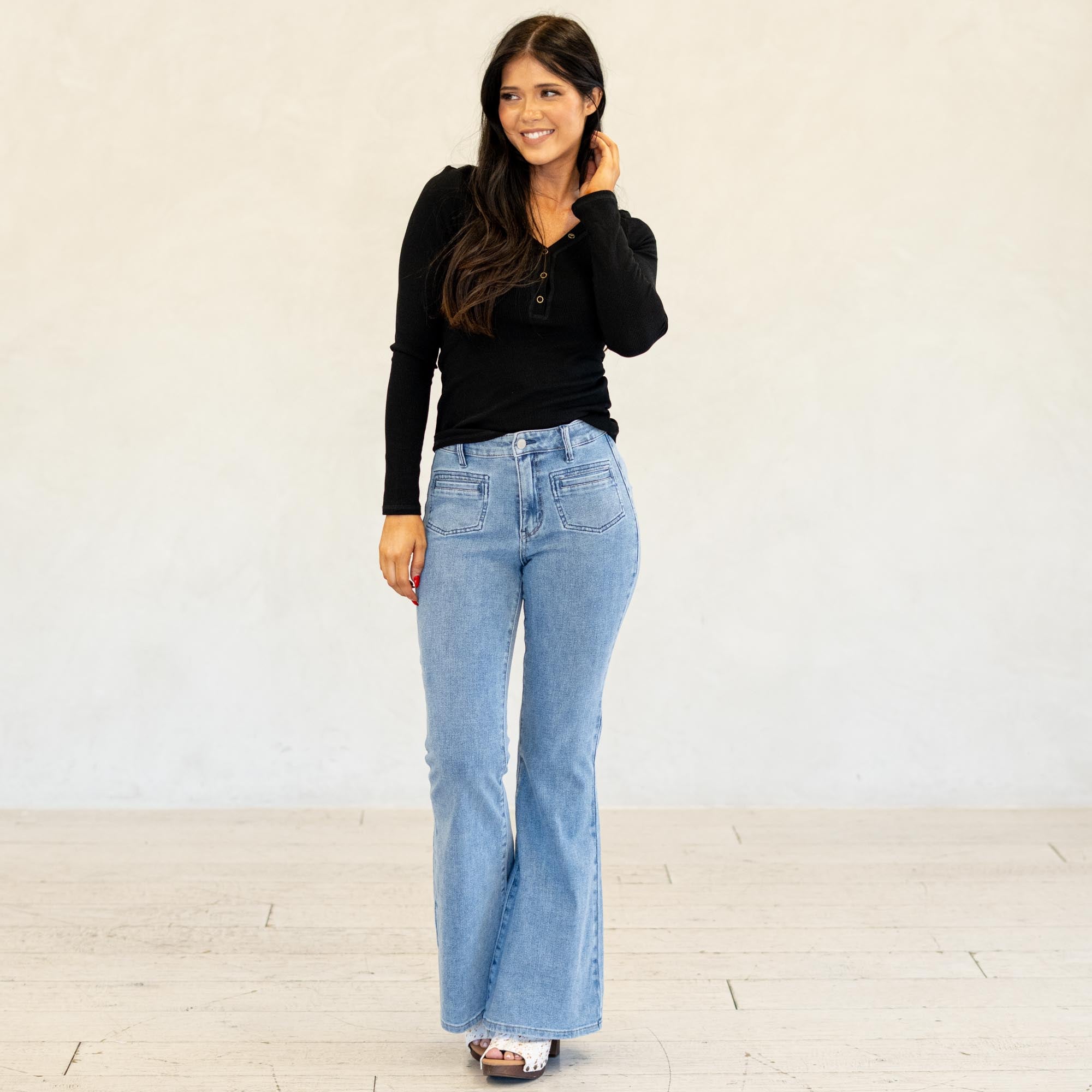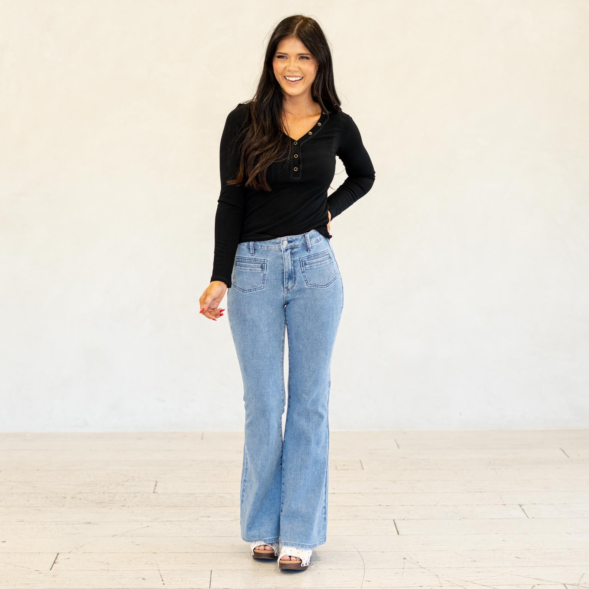 Channel timeless sophistication with the Starlet Flare Pocket Jean. Judy Blue’s high-waisted design flatters your shape while elongating your legs, and the tailored front patch and welt pockets give this flare a polished, elevated finish. The clean dark wash makes them endlessly versatile—perfect for pairing with a tucked-in blouse for workdays or a cozy knit for weekend outings. Designed with Judy Blue’s signature stretch denim, you’ll get that structured look with comfort that lasts all day.