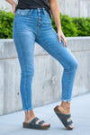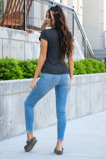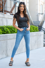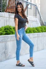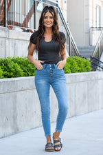 Don't be afraid to wear high-waisted jeans, especially these skinny fits! With a medium blue wash and button fly, these will be new favorites!