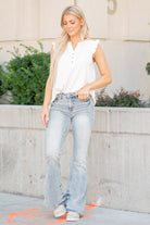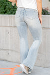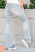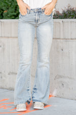 These mid-rise jeans hit the right spot on your waist! With a medium blue wash and pin tack legs, these will be your new go to flares.