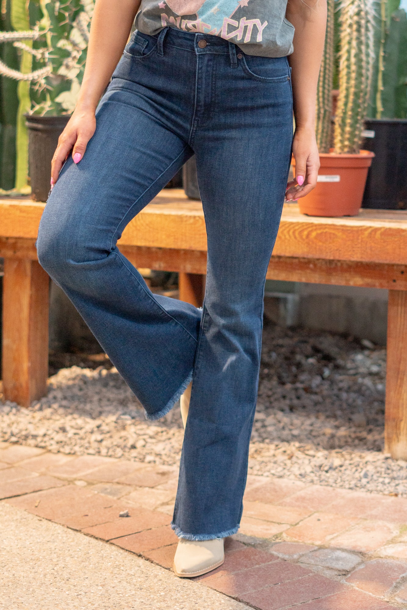 Our Classic Fit Clean Bell Bottom Jeans with a Natural Fray Hem in Dark Wash Denim are your new go-to for laid-back style. With their timeless silhouette and vintage flair, they're perfect for everyday wear. Whether you're grabbing coffee or hanging out with friends, these jeans will add a cool and casual vibe to your outfit.