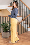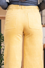 Ultra High Rise Wide Leg Jeans in a vibrant mustard color. Crafted from stretch fabric, these jeans offer both comfort and a trendy look. They feature a zipper fly, unique patched pocket details, and back darts for added style.