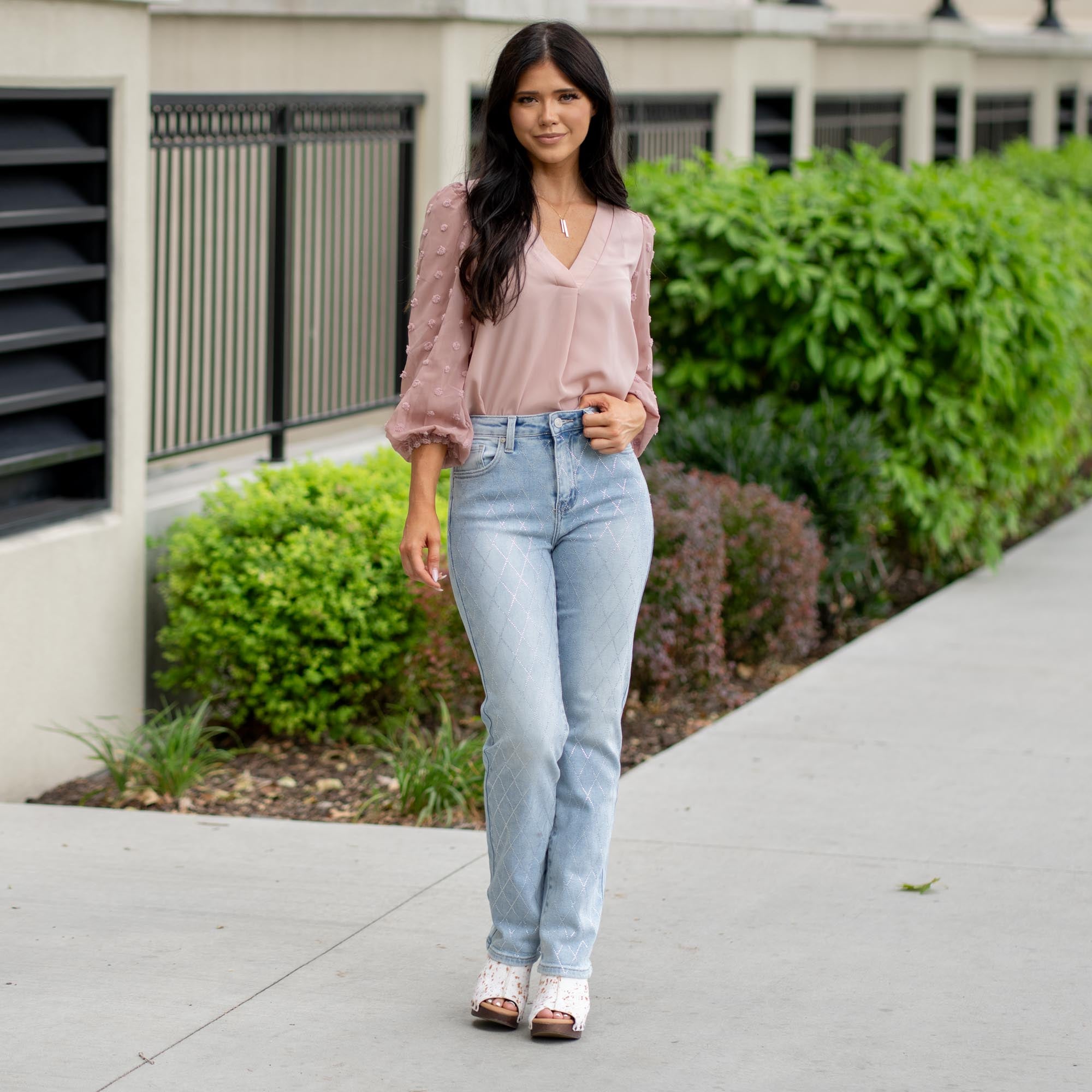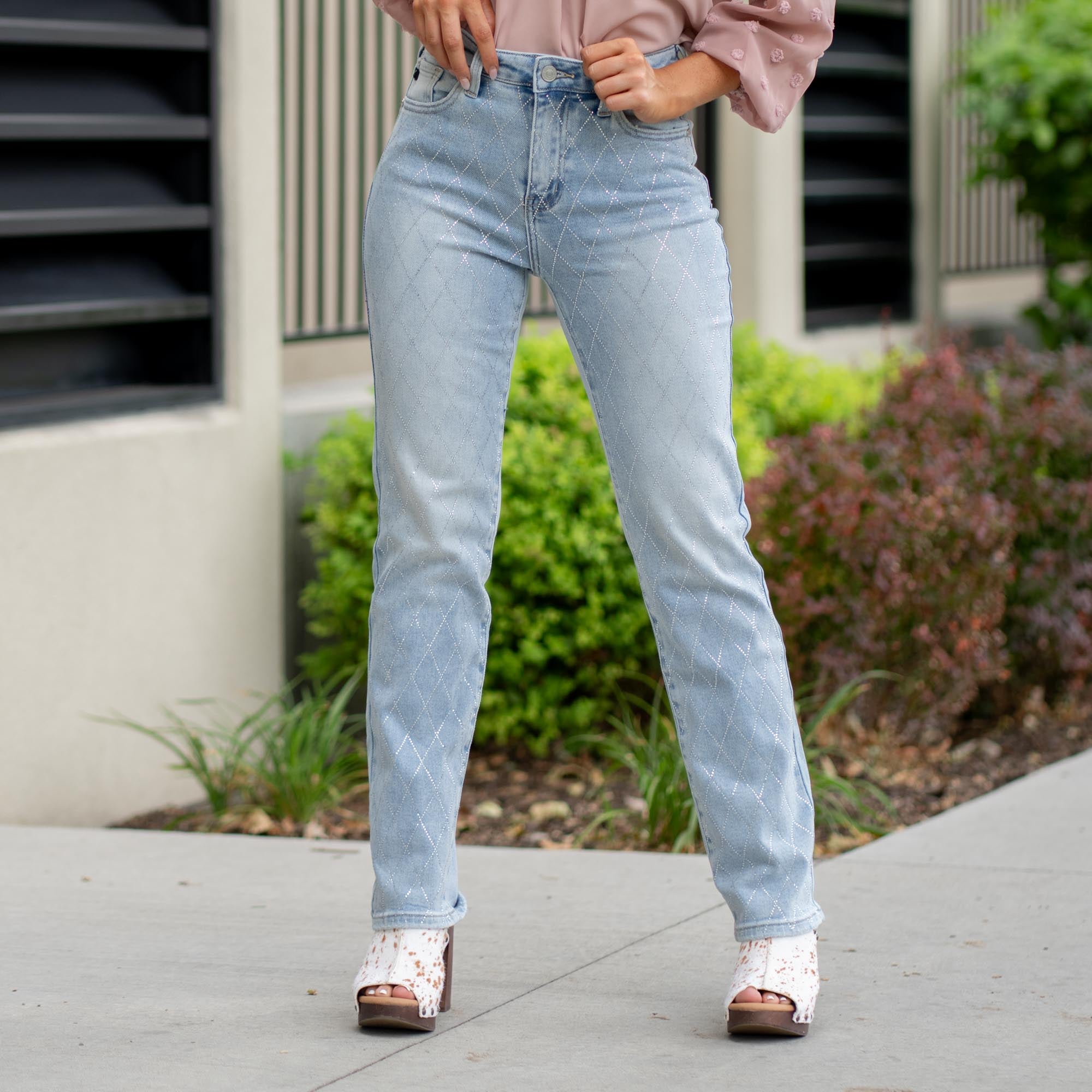 The Cherise Diamond Straight Jean transforms classic denim into a statement piece with shimmering rhinestone details scattered across the front. Designed in a flattering high-rise and timeless straight-leg cut, this light wash jean adds just the right touch of glam without compromising comfort. Complete with a zip fly, single-button closure, and regular hem—it’s the perfect mix of subtle shine and everyday ease.
