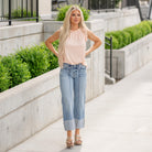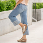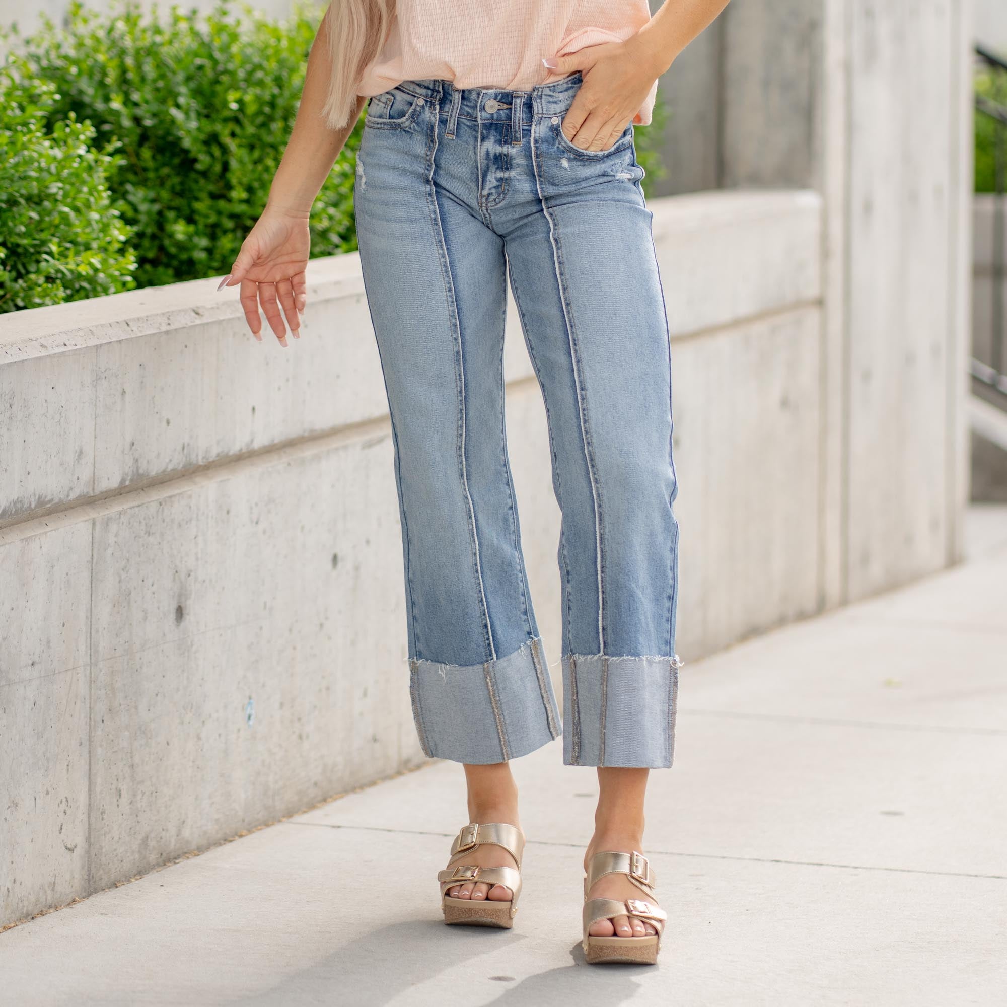 The Margret Mid Rise Cropped Wide Leg Jeans bring a fresh twist to your denim lineup. In a gorgeous medium wash, this standout style features an uneven front waistband, cut seam detailing, and a raw cuffed hem that gives it a lived-in, trend-forward finish. Crafted from soft stretch denim that holds its shape while moving with you, these jeans offer all-day comfort with a bold silhouette. Perfect for pairing with fitted tops or flowy layers—Margret does it all.