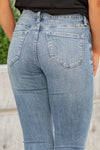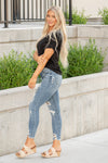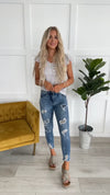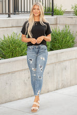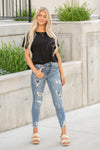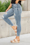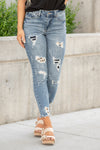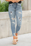 • Color: Dark Wash with Leopard and Denim Backed Distress Patch