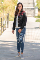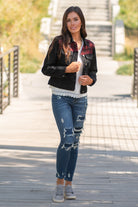 Chloe is 5’8" and 130 pounds. She wears a size 26 in jeans, a small top and 8.5 in shoes. She is wearing a size small in this jacket.