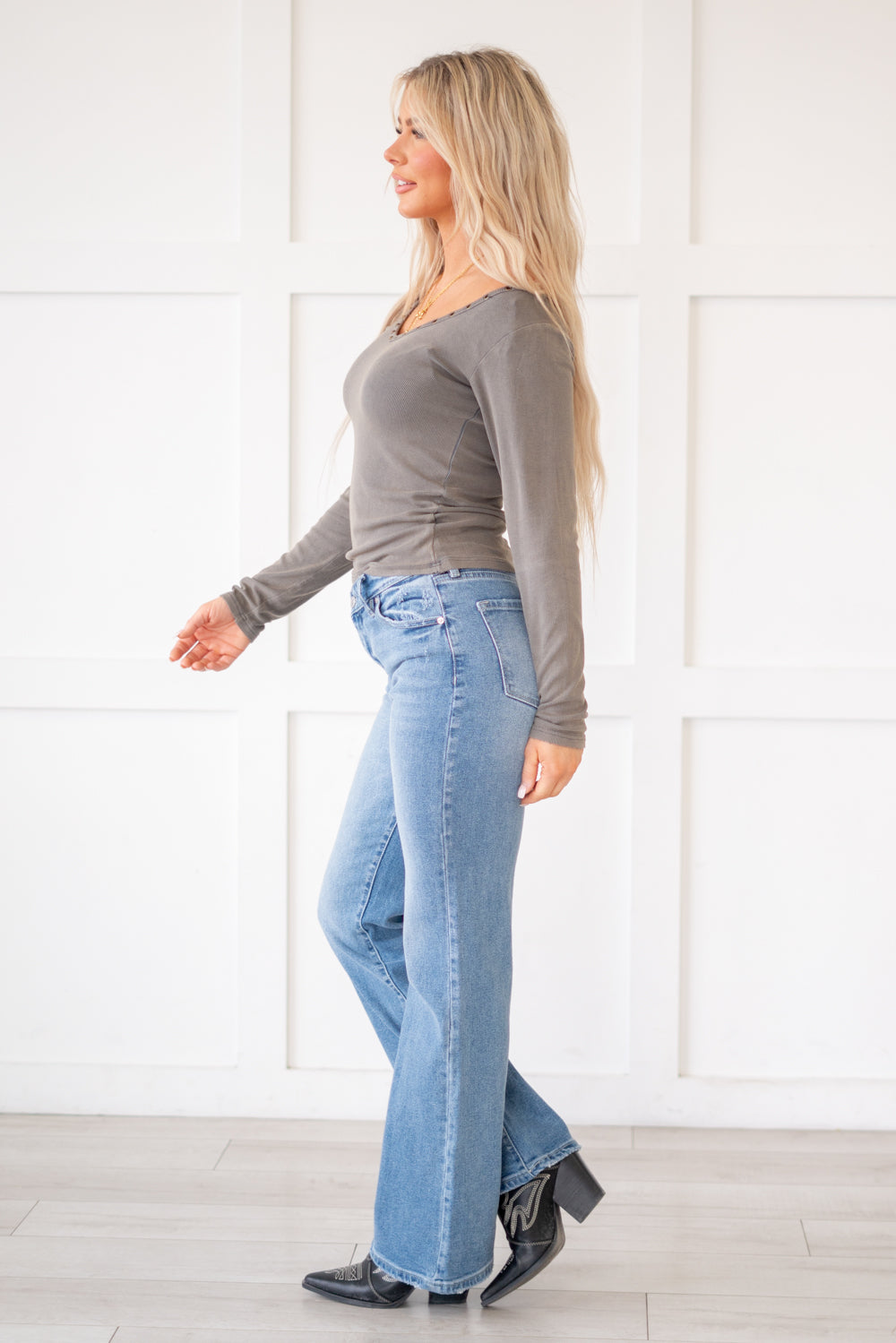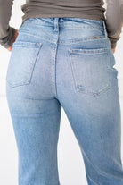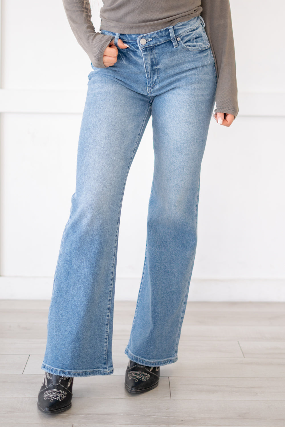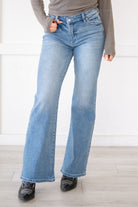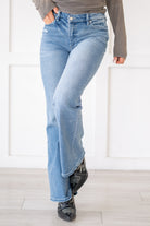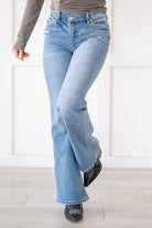 The Lynn High Rise Wide Flare jeans offer the perfect blend of trendy style and retro vibes. Crafted with a wider flare, these jeans exude a nostalgic feel while still being on-trend. Made from soft, buttery stretch denim, they effortlessly hug your curves up to the knees before flaring out wider towards the hems, creating a flattering and eye-catching silhouette. Featuring medium fading and whiskering, these jeans add a touch of vintage charm to your look. With a single-button closure and zip fly, they offer convenience and ease of wear. Whether you're pairing them with a fitted top for a sleek ensemble or embracing a bohemian look with a flowy blouse, these Lynn High Rise Wide Flare jeans are sure to make a statement in your wardrobe.