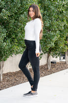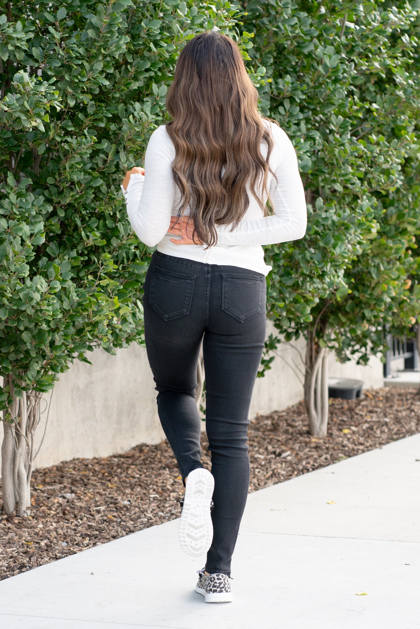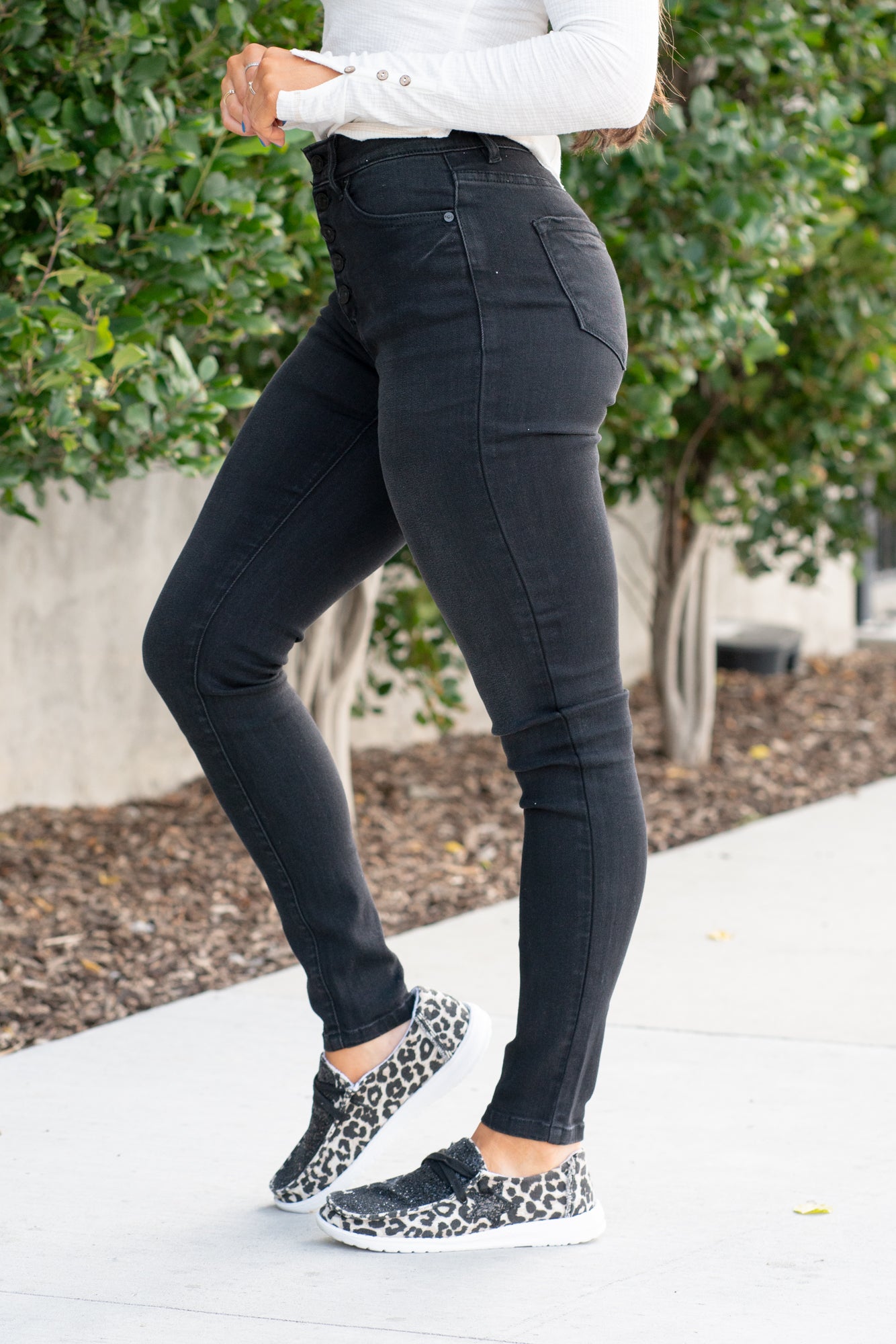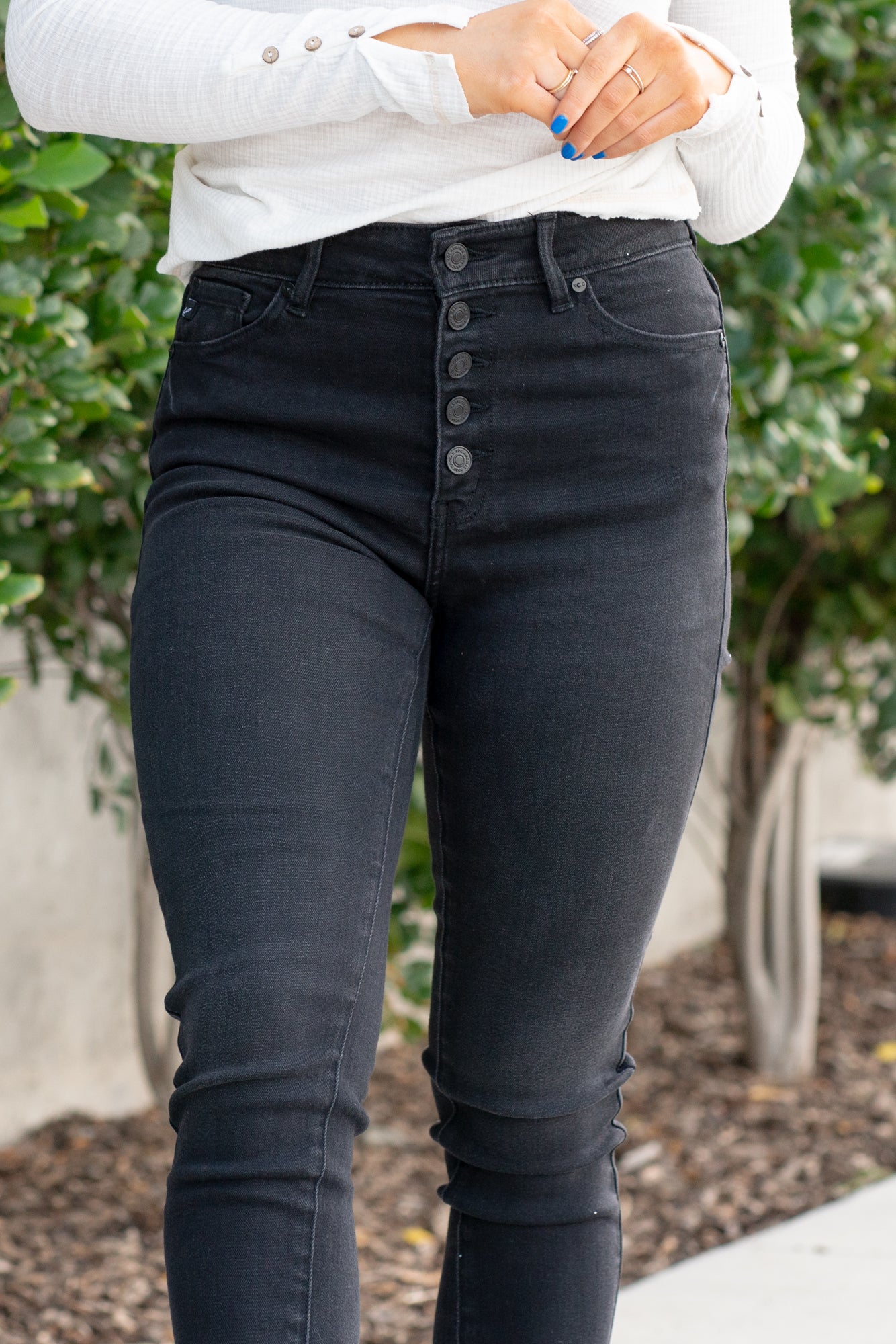These high-rise black wash skinny jeans have the classic KanCan exposed button fly. Dress up this denim with a bodysuit or wear them casual with a crop top to accentuate your waistline.