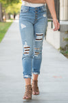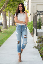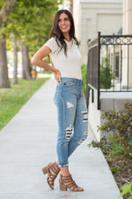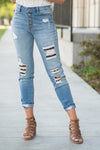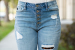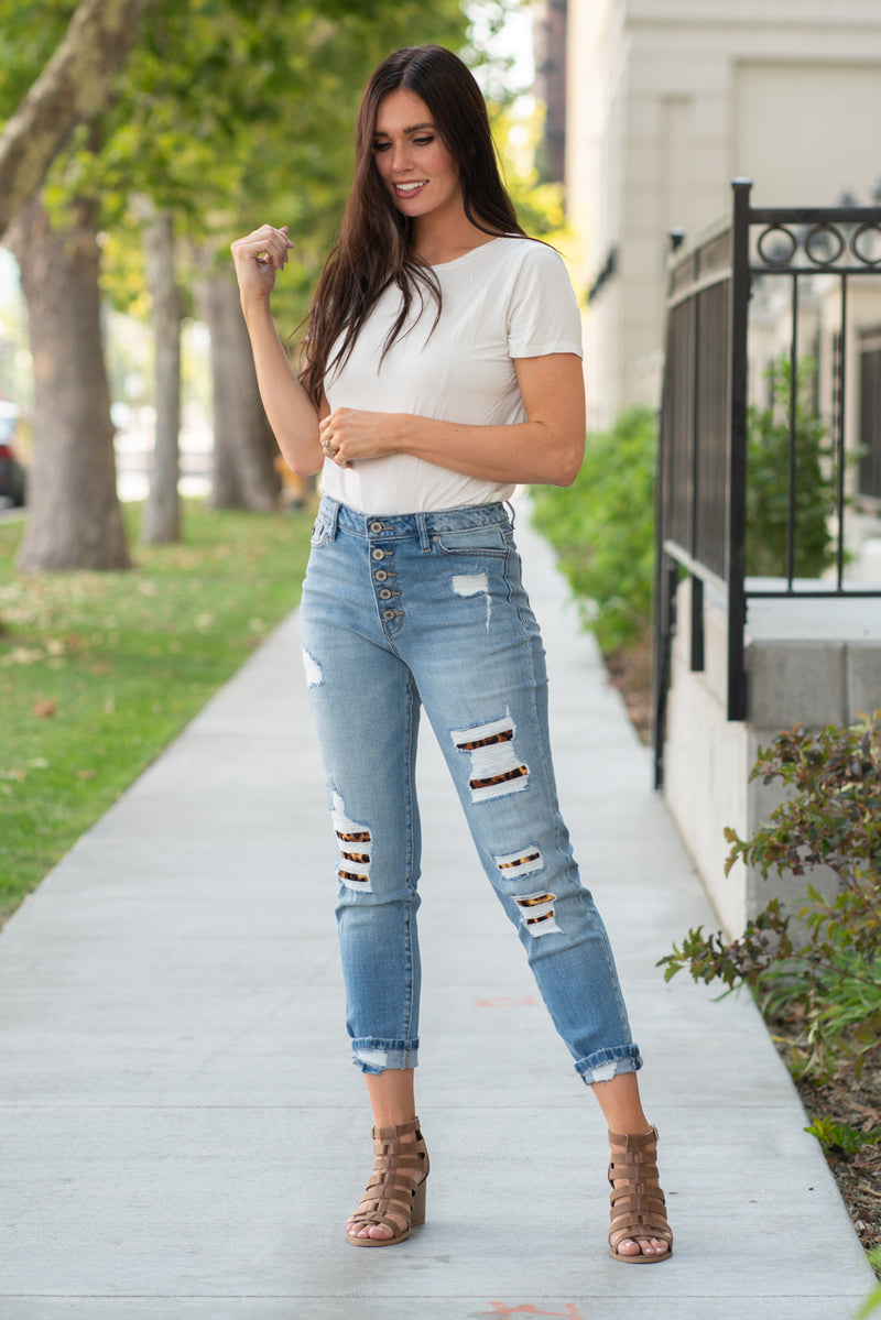 KanCan High Rise Button Fly Leopard Patch Skinny Medium Blue