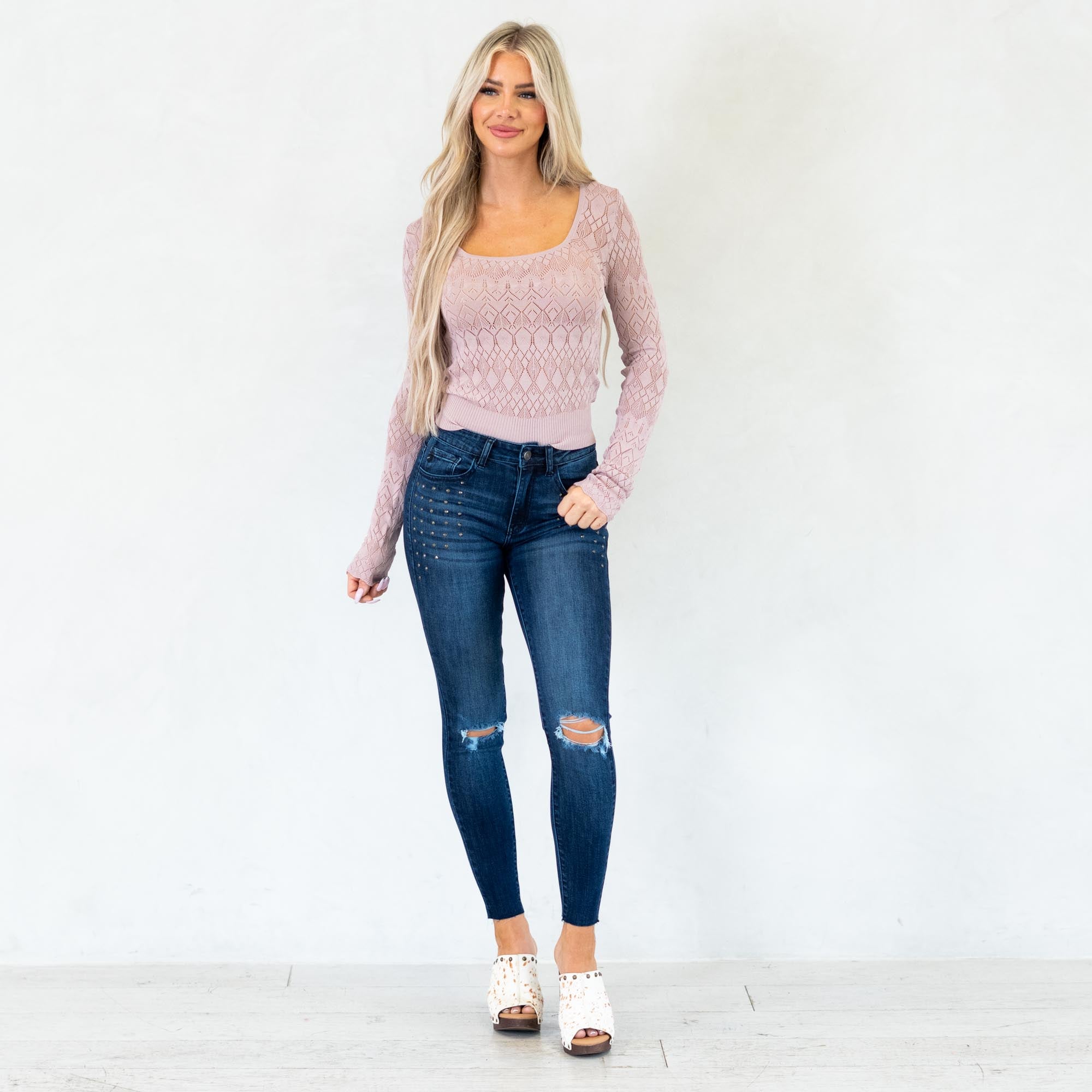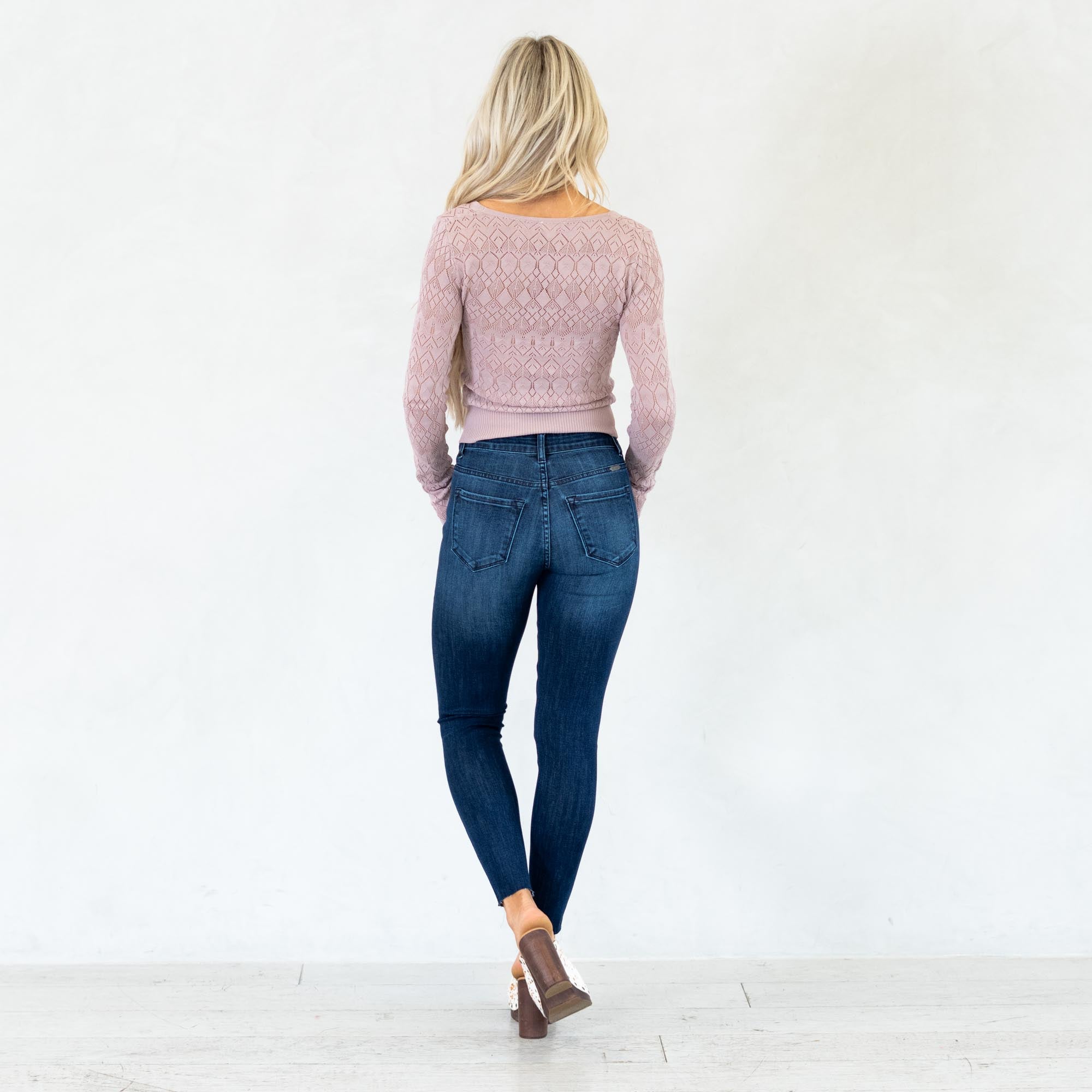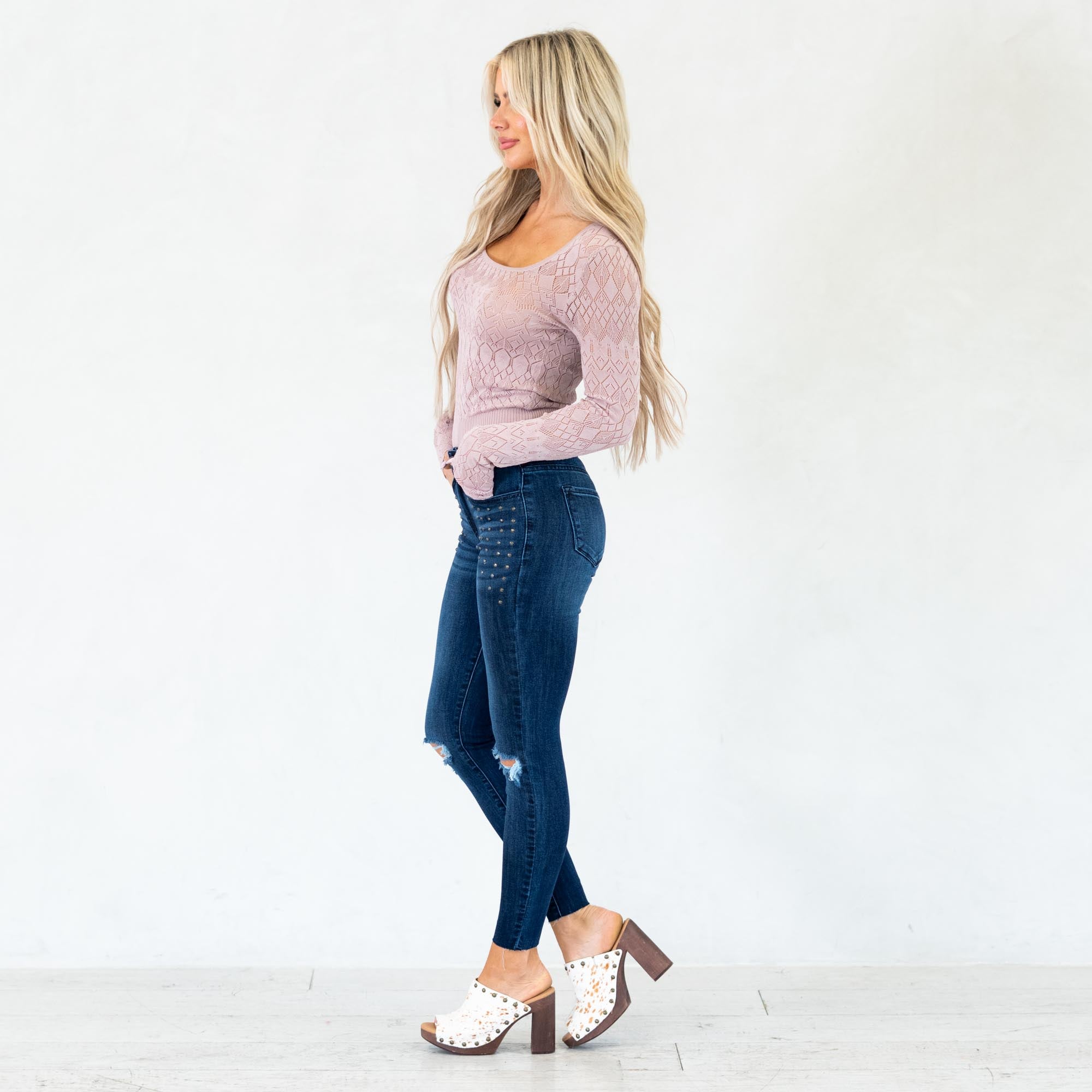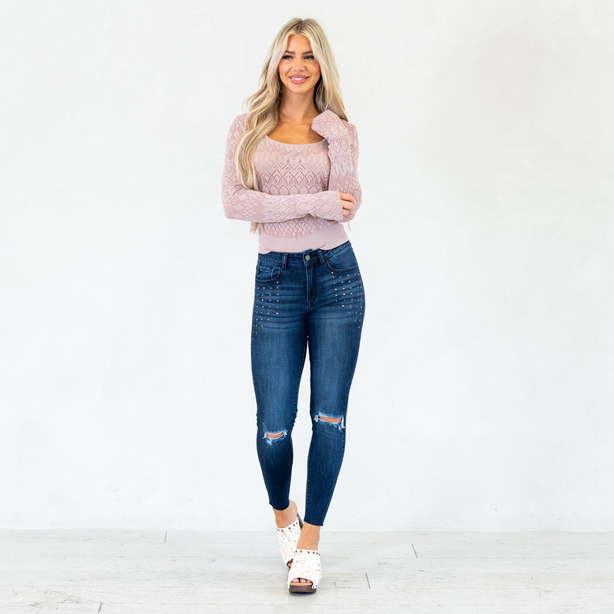 Meet your new favorite pair — the Kate Mid Rise Ankle Skinny Jeans. Designed to sculpt and flatter, these jeans hug your curves in all the right places while offering the perfect amount of stretch for everyday comfort. The dark wash gives them a sleek, polished look, while the subtle stud detailing around the front pockets adds just the right touch of sparkle.
