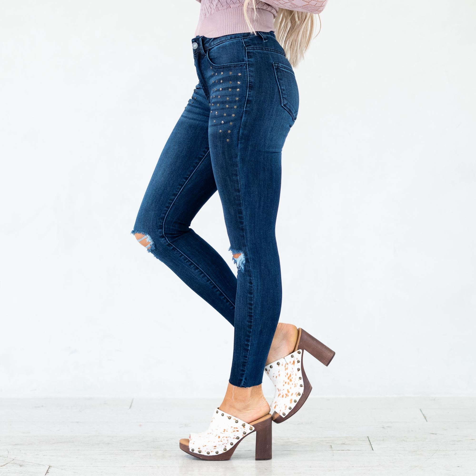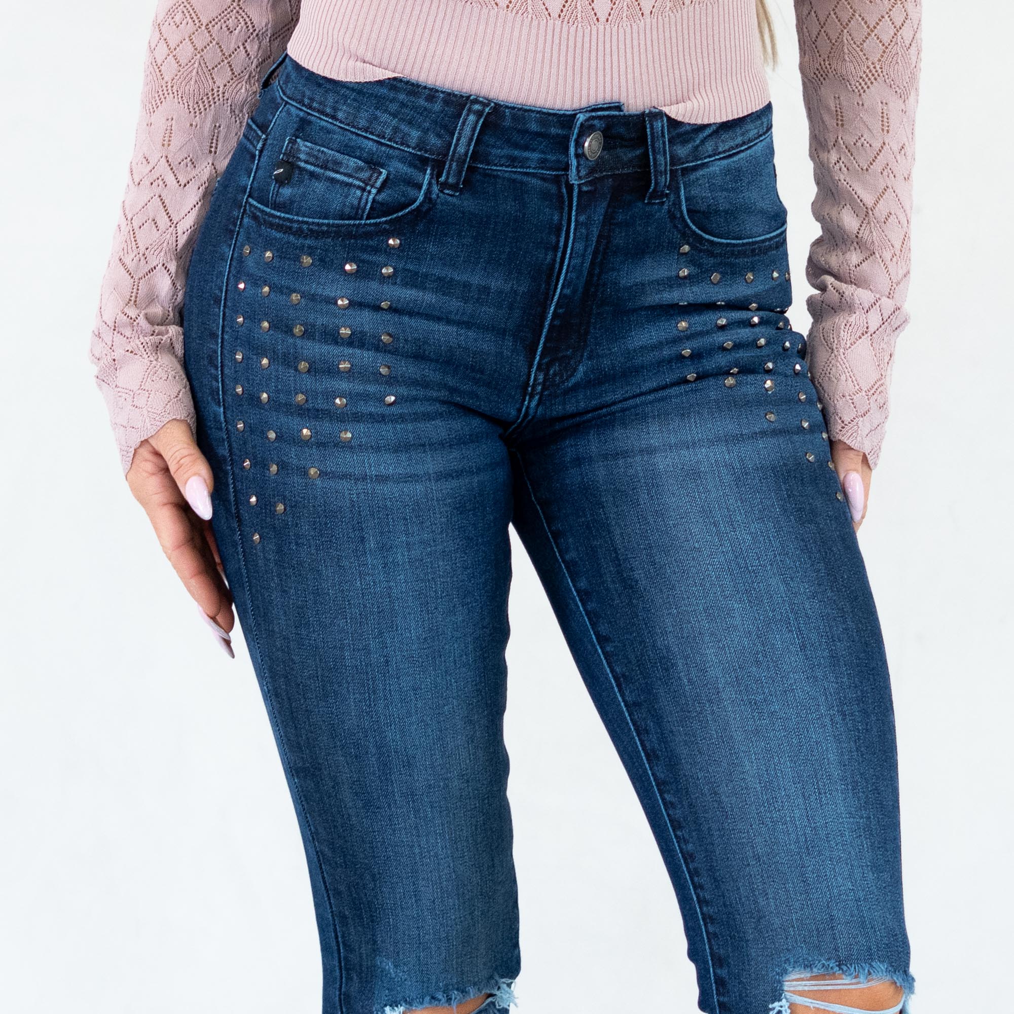 KanCan Kate Studded Mid Rise Ankle Skinny Dark Blue Wash