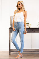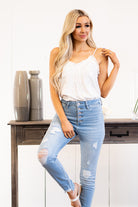 Haley wears a size small top, a 1 in jeans, and a small in tops. She is wearing a size 24/1 in these shorts.