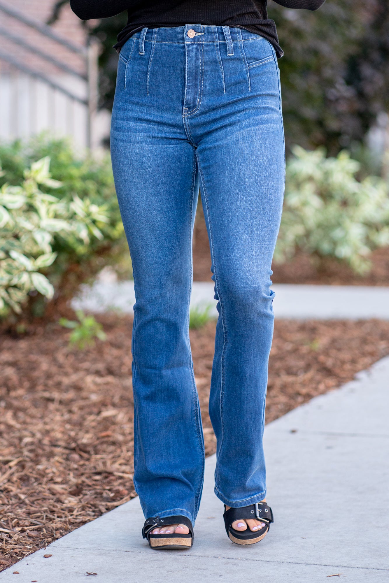 Don't be afraid to wear boot cuts again, not when they look this good! These high-rise jeans hit exactly the right spot on your waist and with some spandex, these will stretch as you wear them and get super comfy!