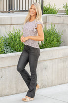 Step up your style game with these low rise boot cut jeans with coated black wash.