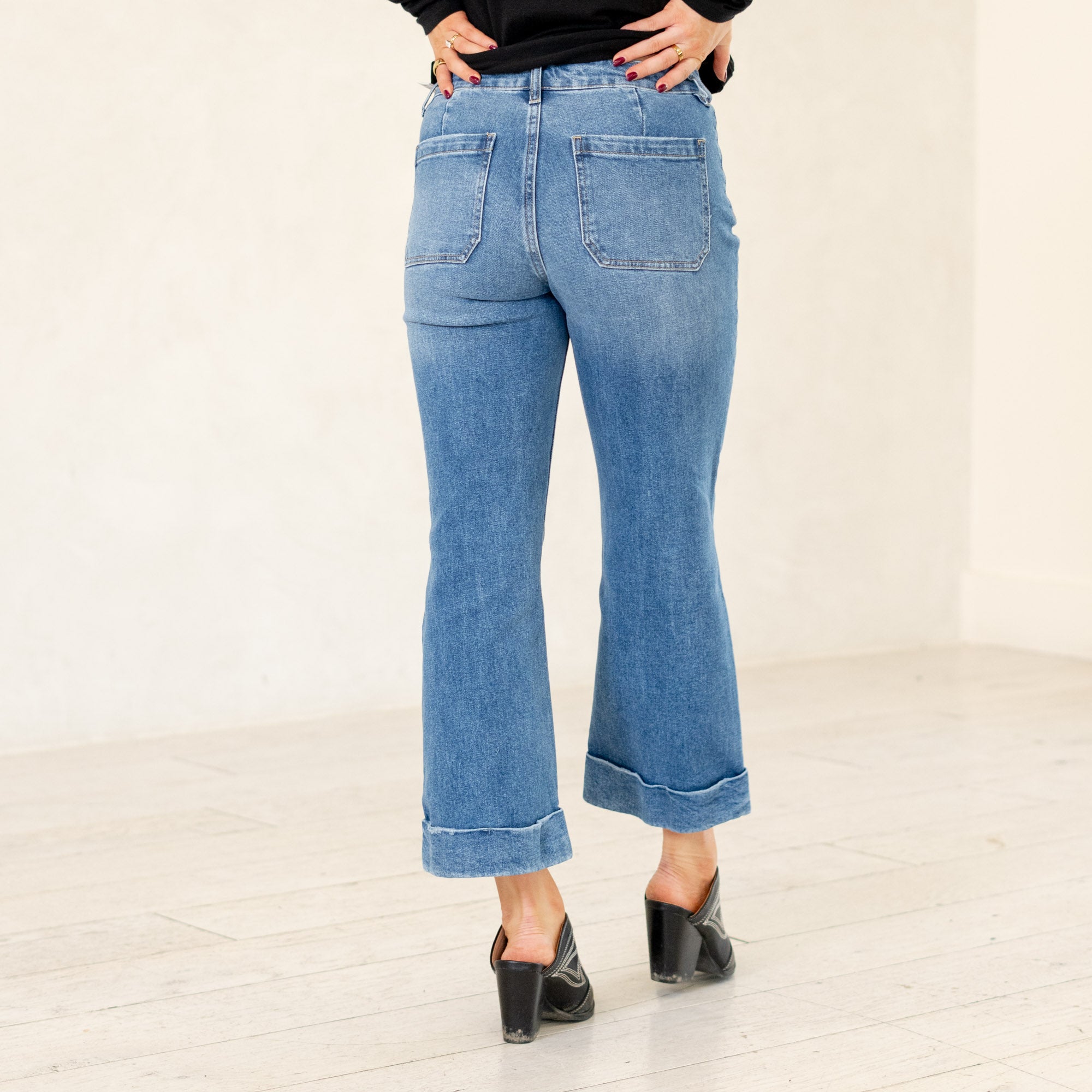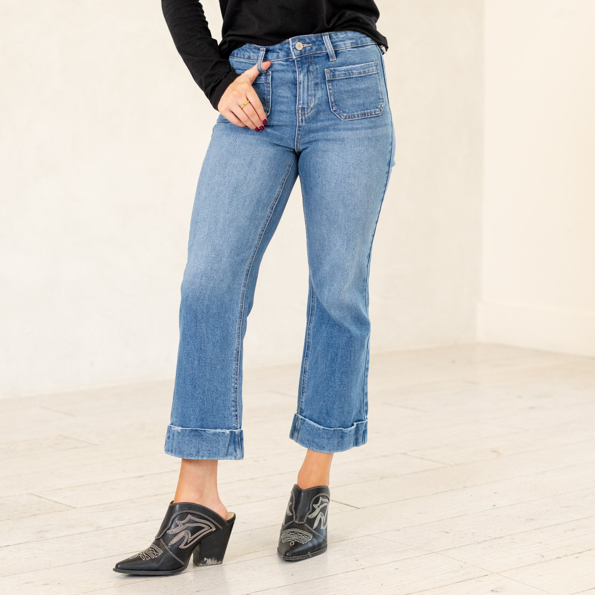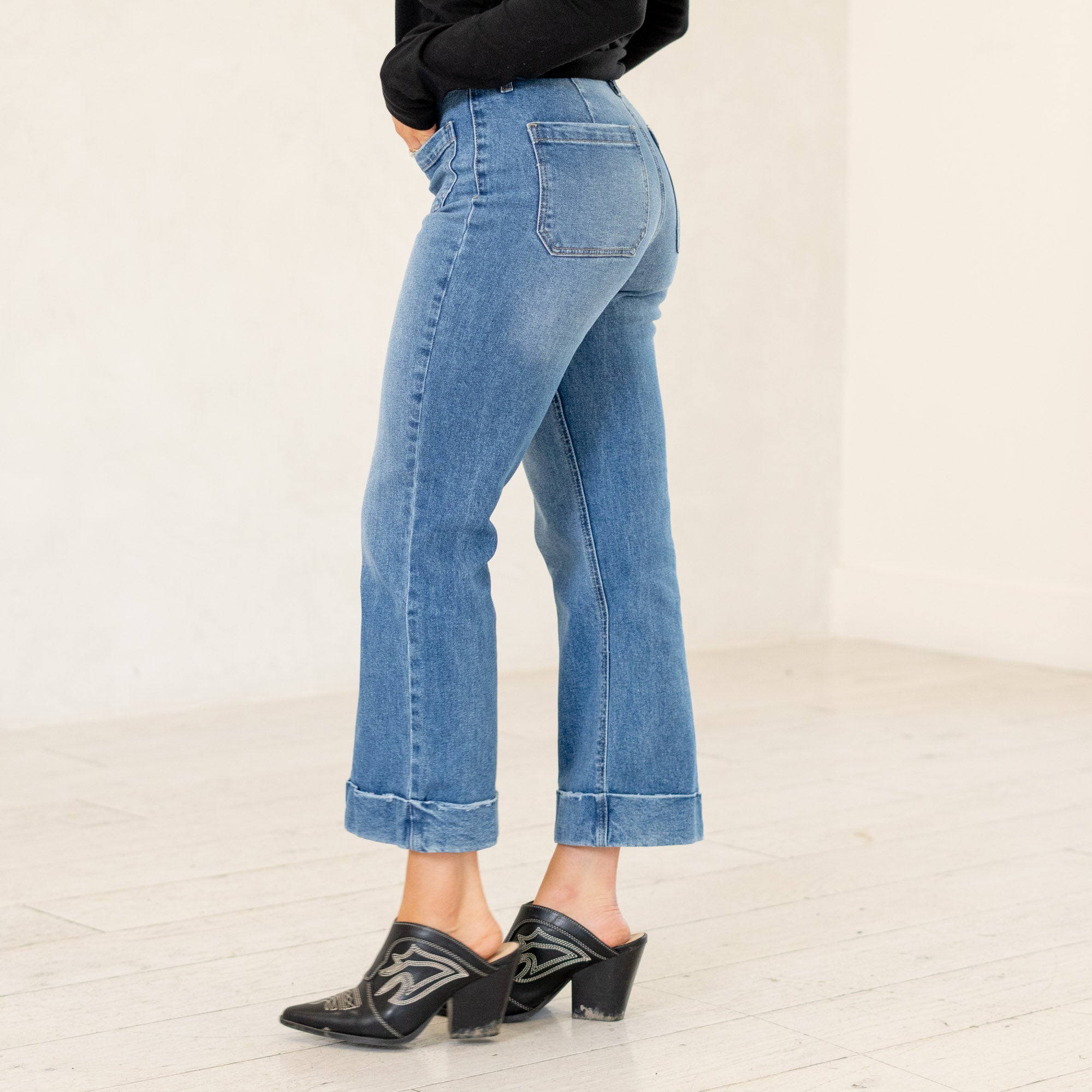 Say hello to your new off-duty favorite. The Angelina Cropped Flare Jeans come in a soft light wash and offer a flattering high rise that relaxes through the leg before kicking out at the hem. With front patch pockets, a 2" single fold, and a laid-back silhouette, this style brings major cool-girl energy. Whether you pair them with sneakers or heels, these jeans were made to stand out while keeping it effortless.