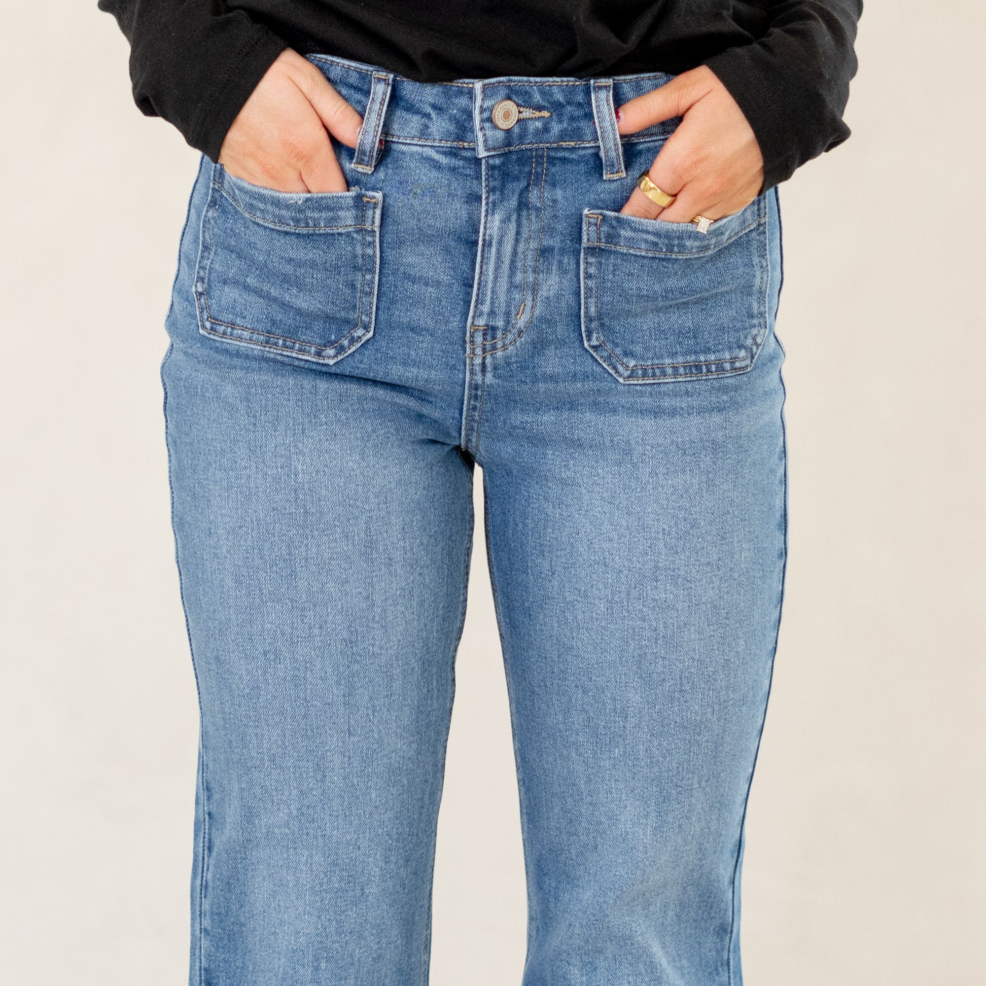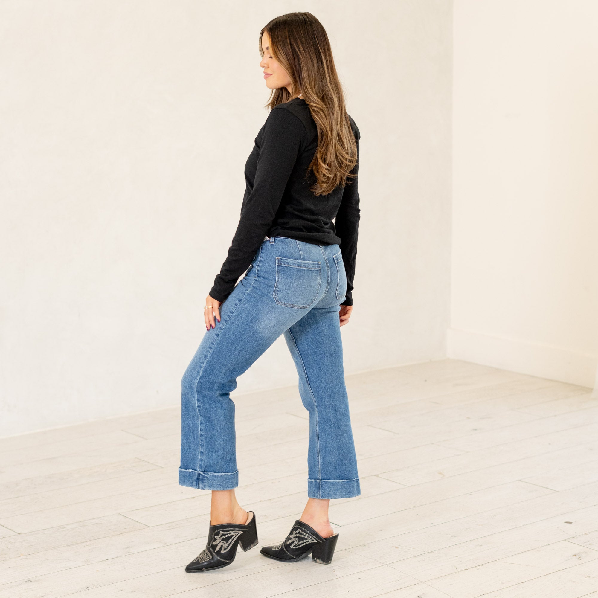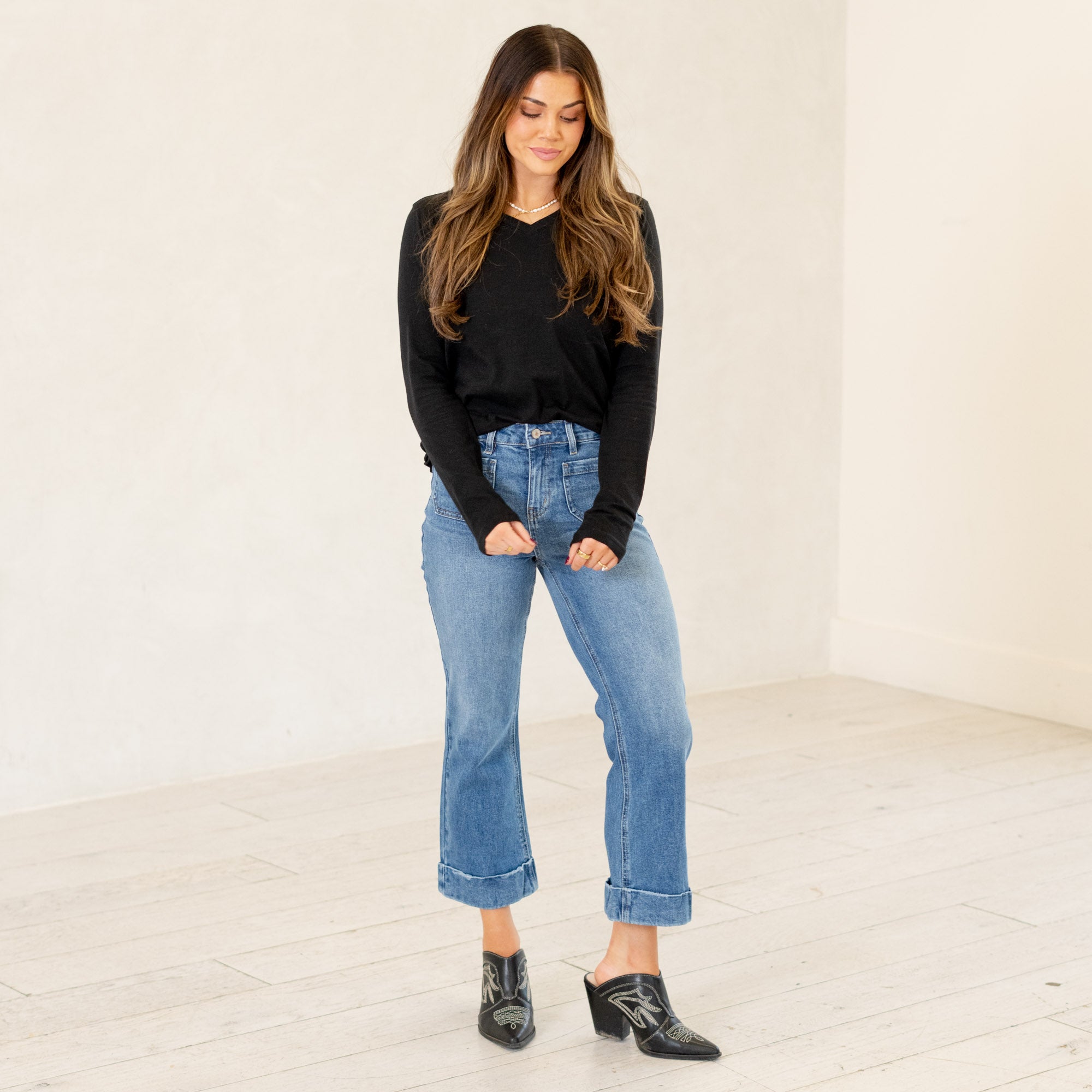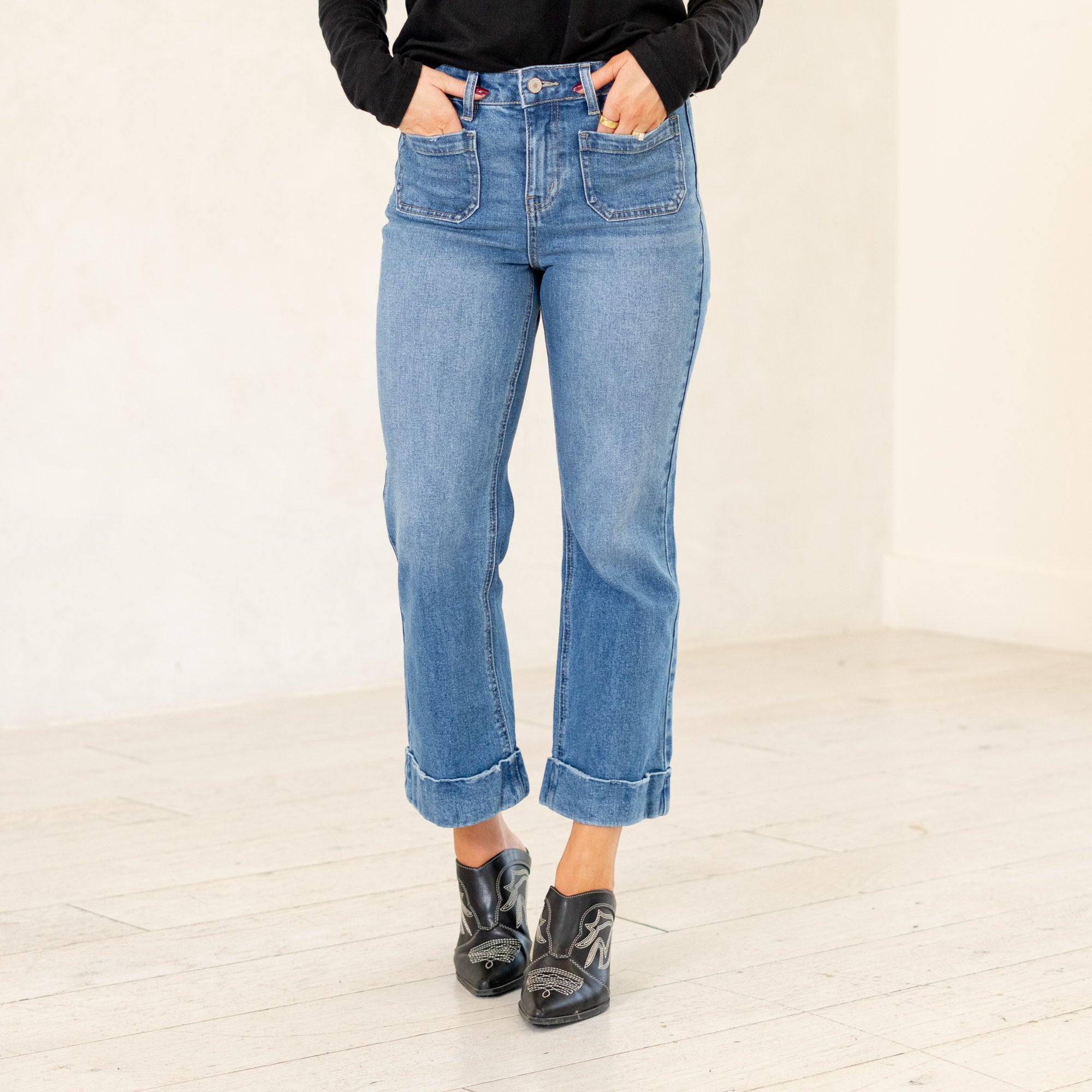 Say hello to your new off-duty favorite. The Angelina Cropped Flare Jeans come in a soft light wash and offer a flattering high rise that relaxes through the leg before kicking out at the hem. With front patch pockets, a 2" single fold, and a laid-back silhouette, this style brings major cool-girl energy. Whether you pair them with sneakers or heels, these jeans were made to stand out while keeping it effortless.