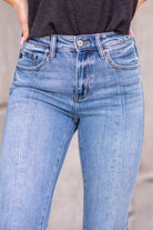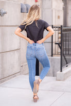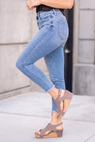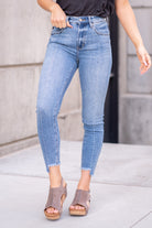 These high-rise ankle skinny jeans are a versatile addition to any wardrobe. The medium wash creates a sophisticated, timeless look, while the distressed details give them a touch of edgy style. With a stretchy fabric that moves with you, these jeans are both comfortable and flattering. Whether dressed up or down, these jeans are sure to become a go-to favorite.