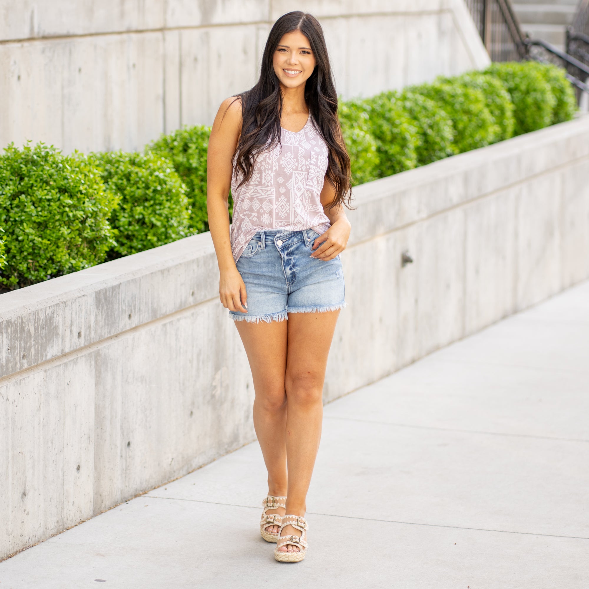 The Carnelia Crossover Shorts bring a fresh twist to classic denim. Designed in a stunning medium wash, this high rise pair features a crossover waistband and contrast detailing that instantly elevates your look. Finished with a one-button closure, zip fly, and classic five-pocket styling—these shorts are made to stand out from every angle.