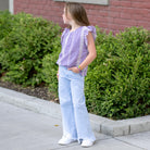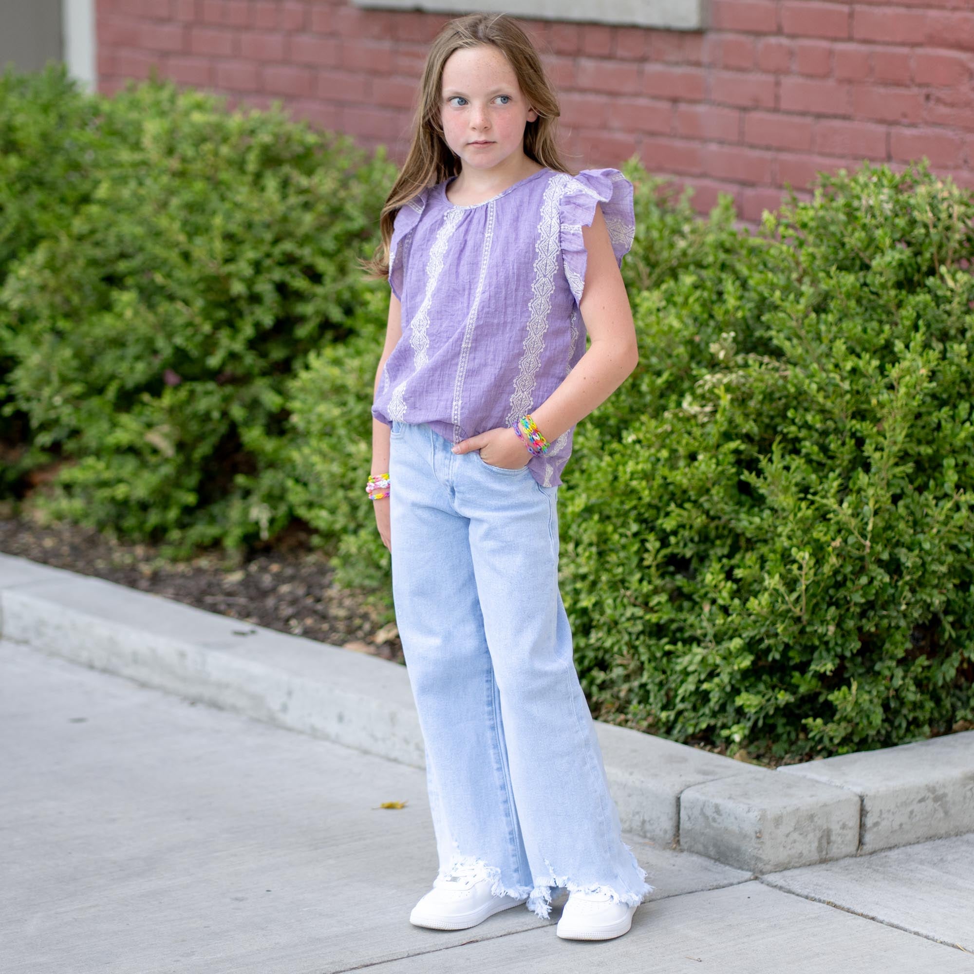 Let her channel bold style with our Zendaya High Rise Wide Leg Jeans. Designed with a frayed hem and roomy wide-leg silhouette, these jeans bring both comfort and cool to her everyday looks. Finished with a single button closure, classic 5-pocket design, and zip fly—perfect for school days, play dates, and everything in between.