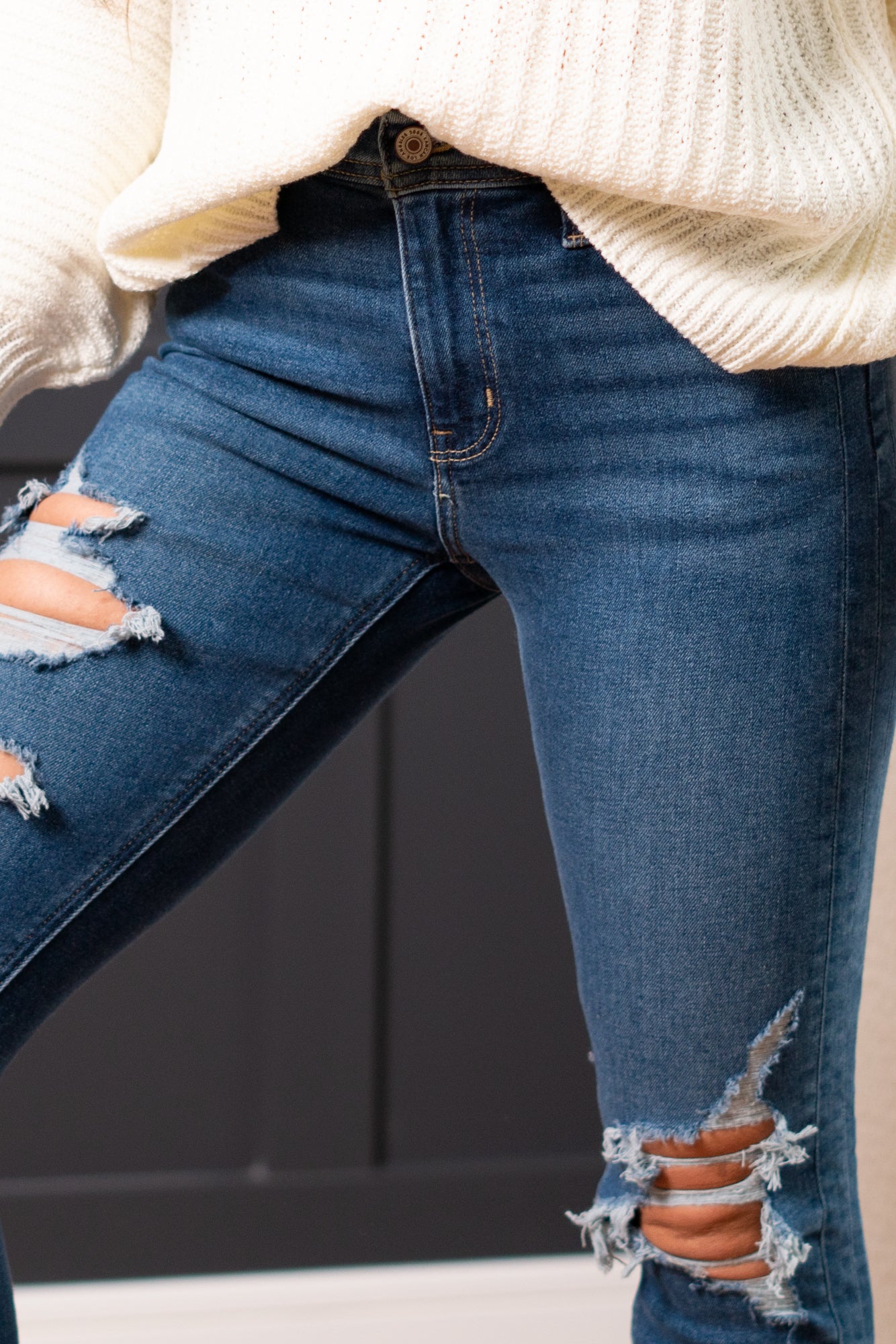 These high-rise blue wash skinny jeans have distressed legs and ripped hems with stretch!