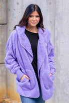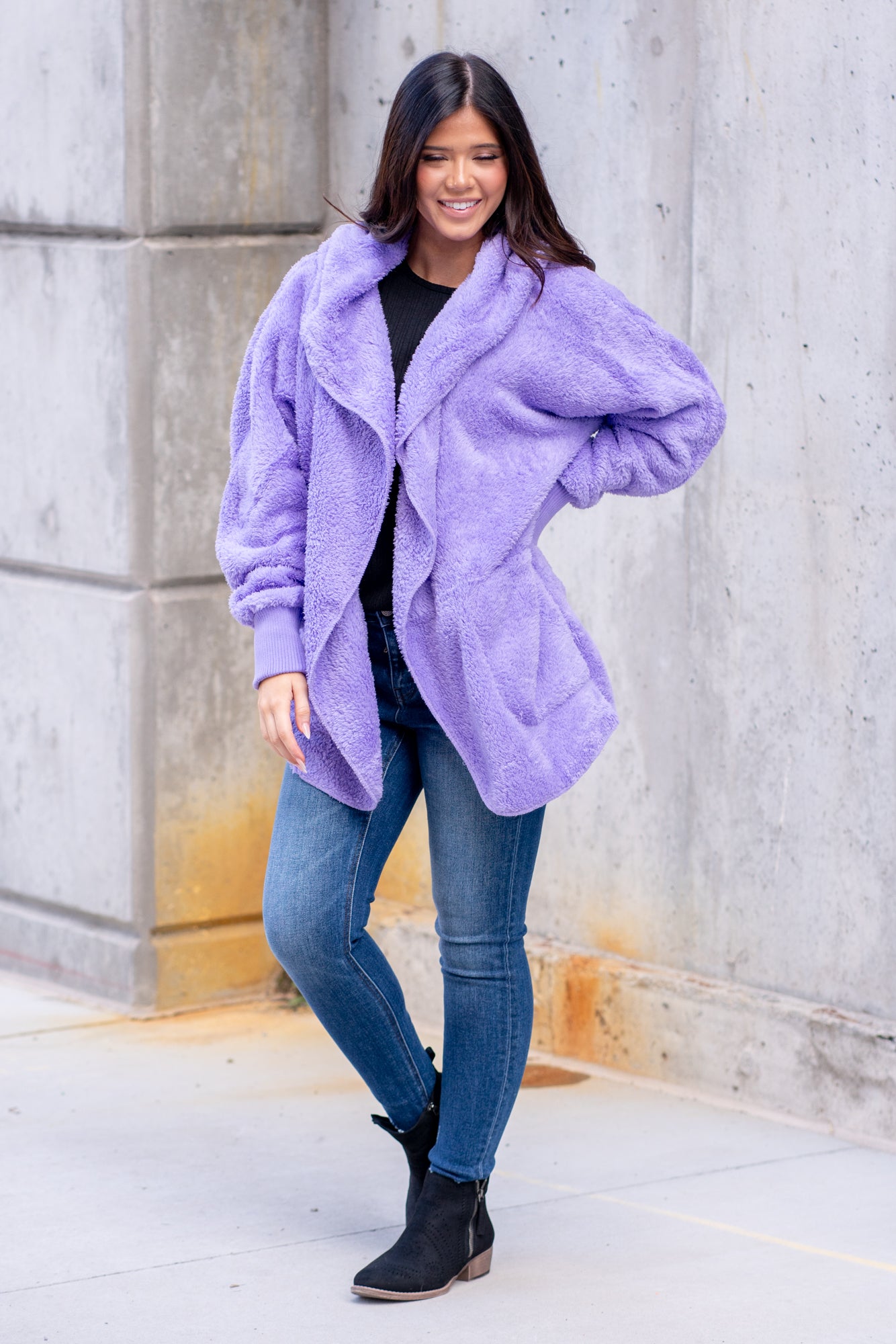 This is that cozy jacket you will throw on every day and go! One size fits most with an open neckline and long sleeves and side pockets.