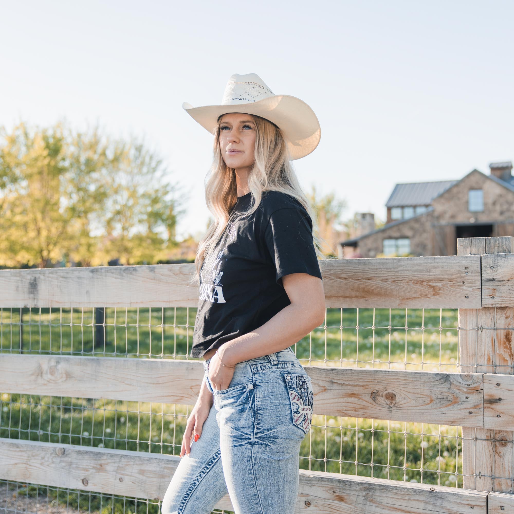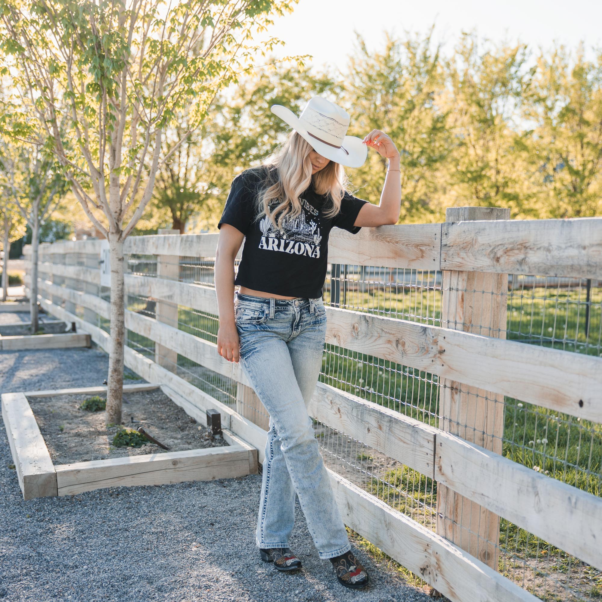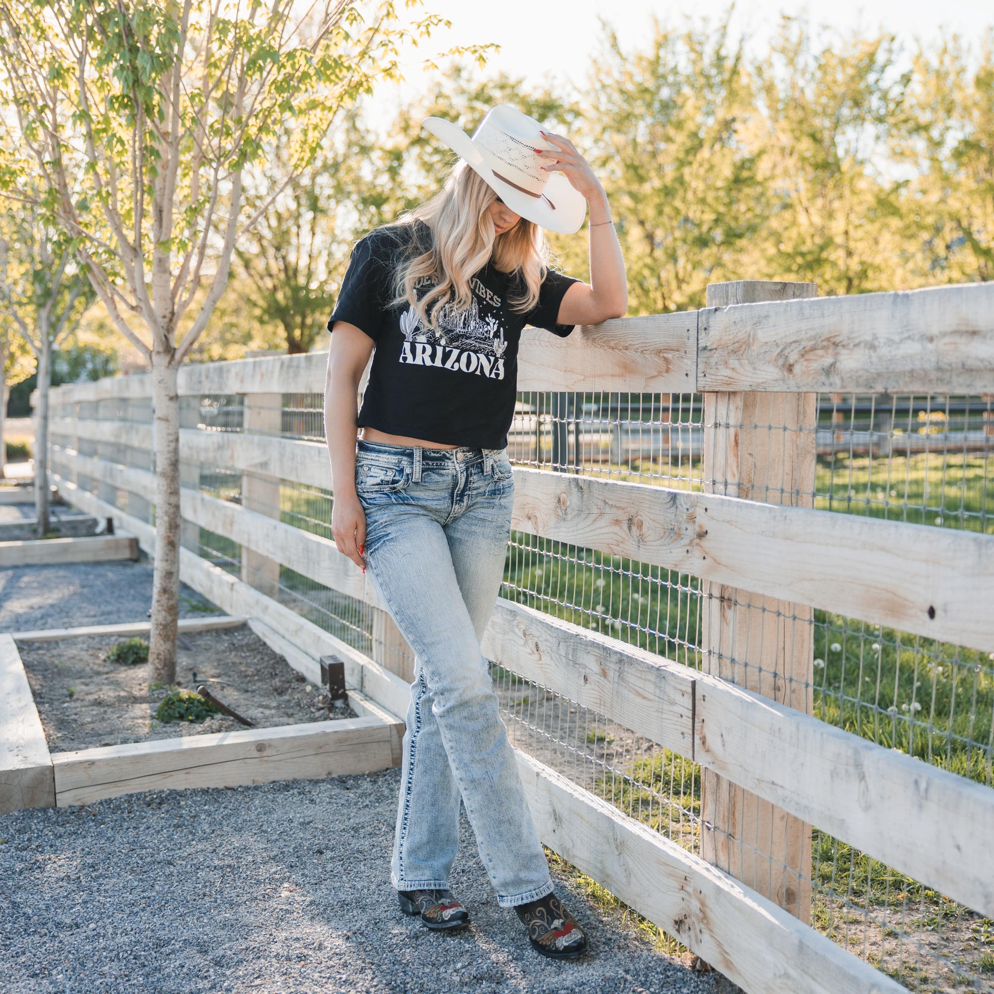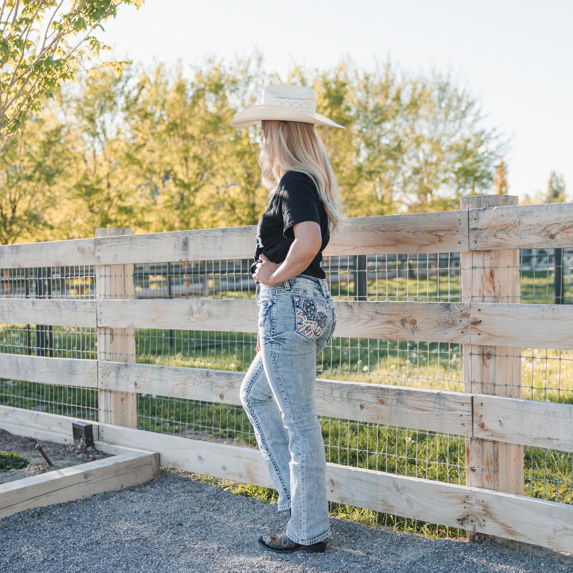 - Embroidered Americana design on frayed yoke and faux flap pockets