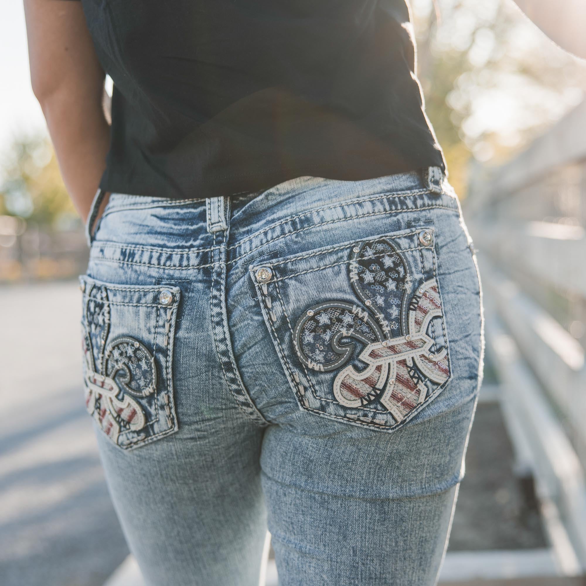 - Embossed white leather cross over Americana flag Miss Me brand patch