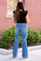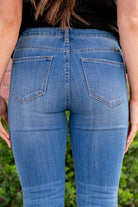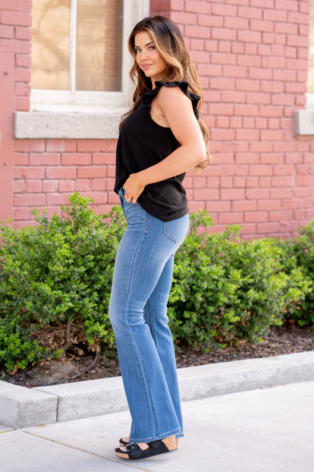 Jacquelyn wears a size 25 in jeans, a small in tops, and 6.5 in shoes. She is wearing a size 25 in these jeans.