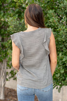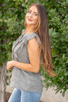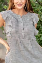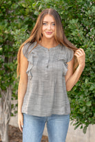 Pintuck Front Sleeveless Sheer Blouse featuring Ruffle Trims and Half Button-Down Details.