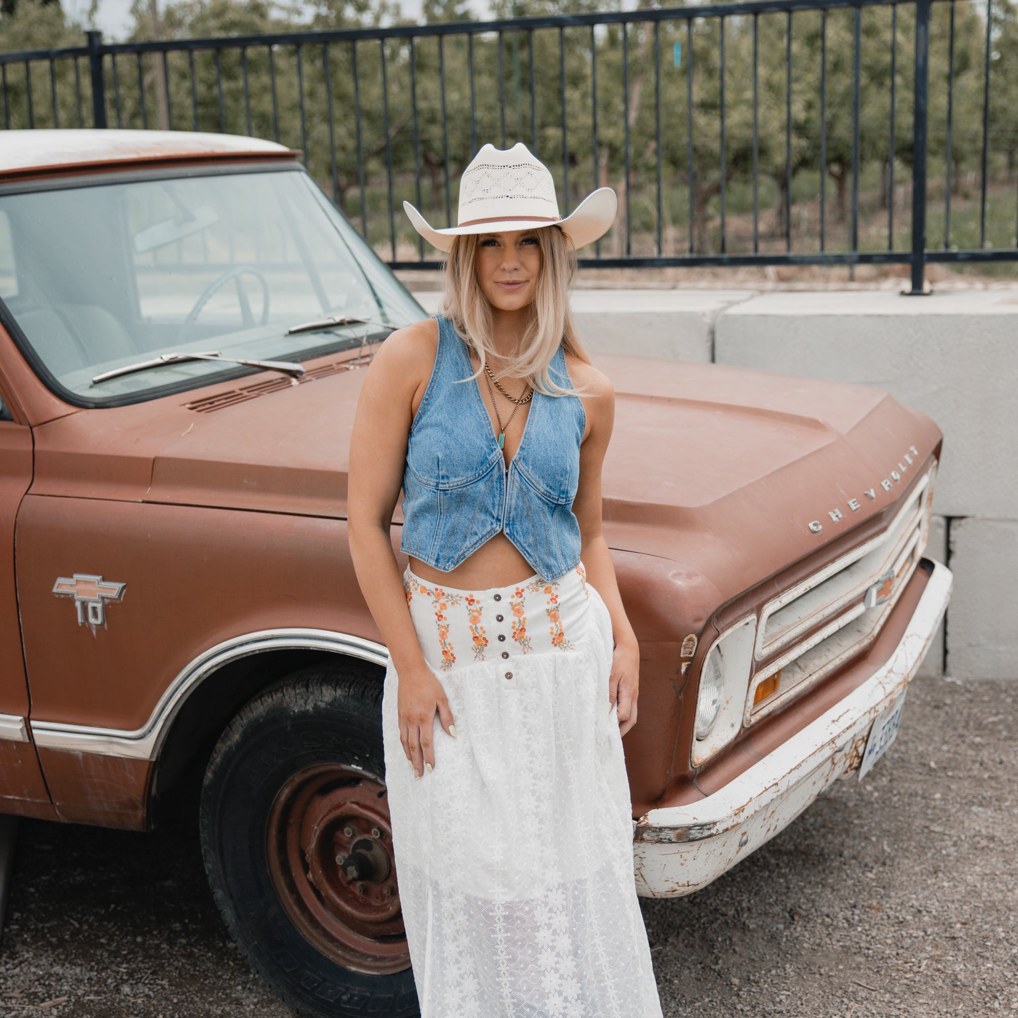 The Delilah Denim Bustier is your new go-to for flirty, structured style. Featuring a plunge neckline and sculpting bustier seams, this cropped denim top brings major attitude with a sleek hook-and-eye front closure. Perfect for pairing with high-rise jeans or layering under a blazer for an edgy-chic look.
