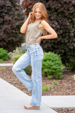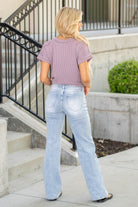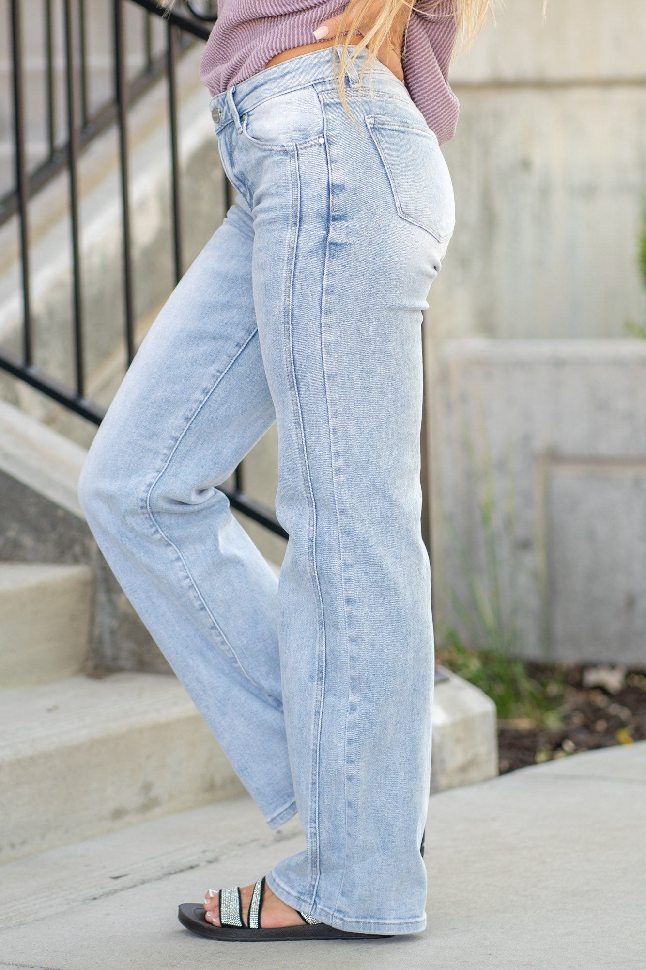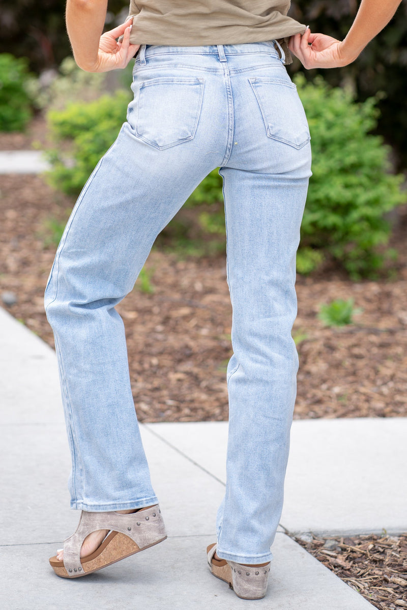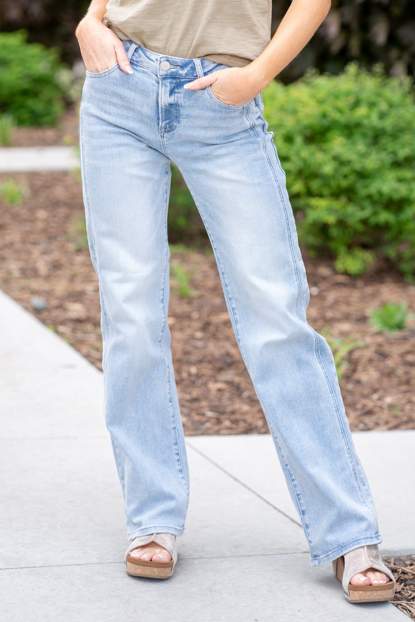 These light blue wash mid-rise straight leg jeans offer a versatile and timeless look. The flattering mid-rise waist and straight leg cut create a streamlined silhouette. With their vintage charm and modern appeal, these jeans are a classic wardrobe staple for both casual and dressier occasions.