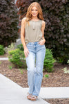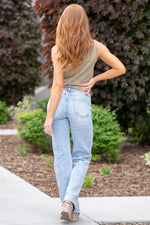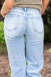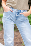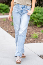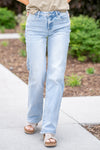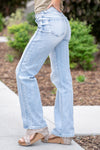 These light blue wash mid-rise straight leg jeans offer a versatile and timeless look. The flattering mid-rise waist and straight leg cut create a streamlined silhouette. With their vintage charm and modern appeal, these jeans are a classic wardrobe staple for both casual and dressier occasions.