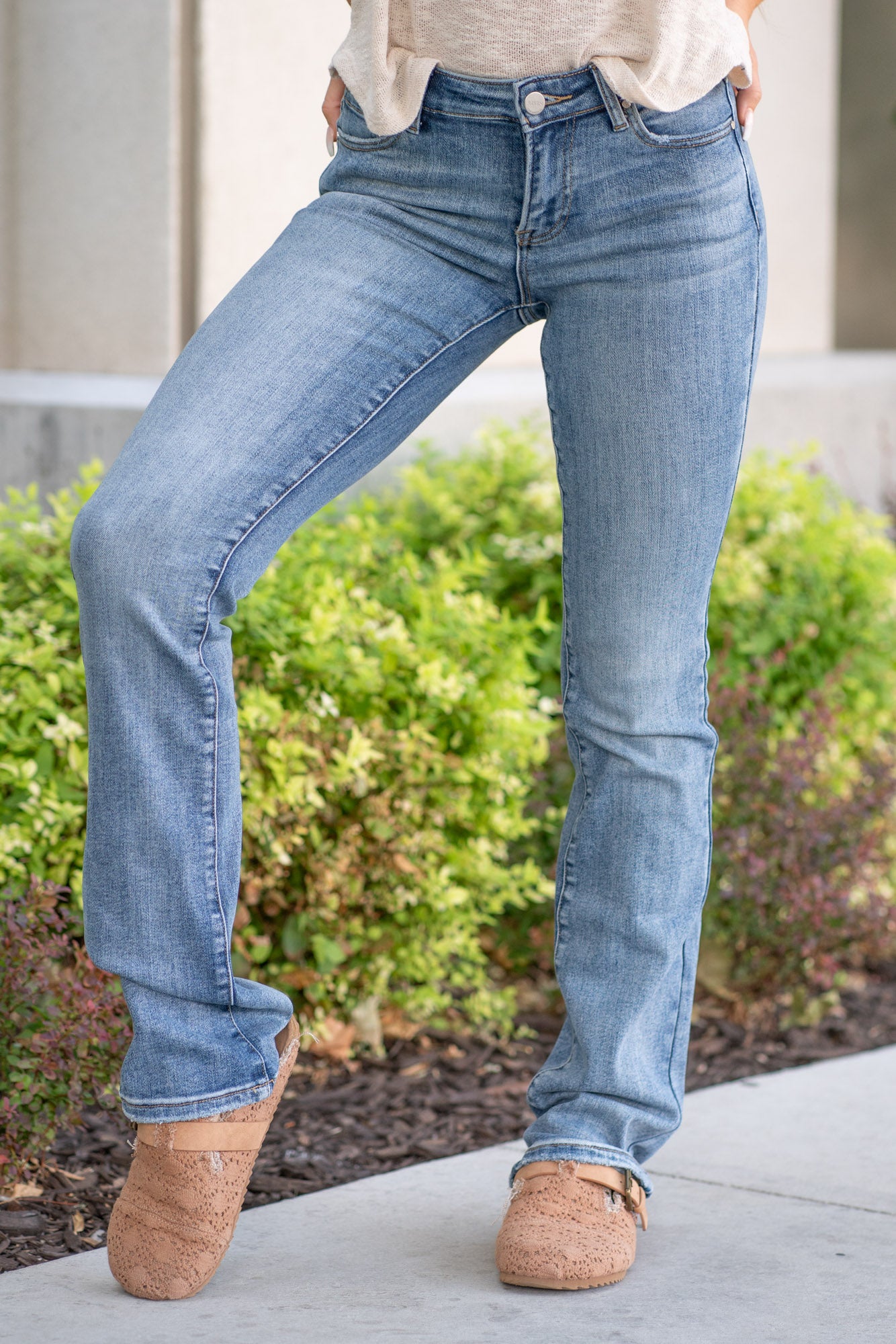 These Risen jeans feature a classic straight leg with a flattering 34 1/2" inseam, perfect for a sleek, elongated look. With a comfortable mid-rise fit and a 9 1/2" front rise, they offer a modern silhouette in a versatile medium wash. Made from a blend of 80% cotton, 18% polyester, and 2% spandex, these jeans provide the right amount of stretch and structure, finished with a convenient zipper fly.