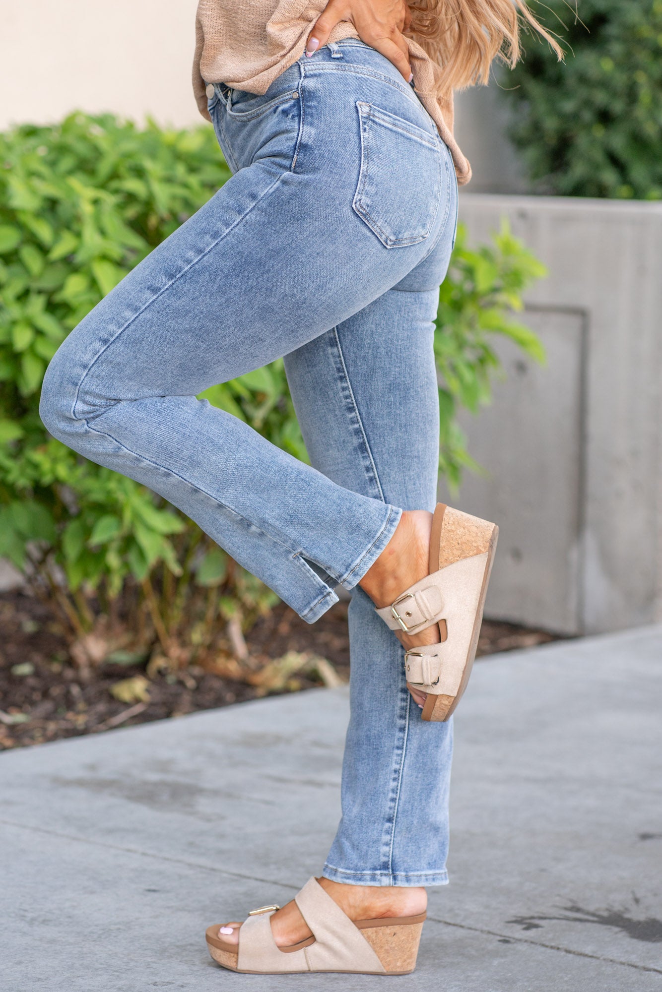 These relaxed straight-leg Risen jeans, with a 30" inseam, offer the perfect blend of comfort and style. The high-rise fit with a 10 1/2" front rise ensures a flattering silhouette, while the medium wash makes them versatile for any occasion. Crafted from 73% cotton, 25% polyester, and 2% spandex, these jeans provide the right amount of stretch and durability, complete with a zipper fly for a classic finish.