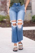 These Mid Rise Distressed Cropped Flare Jeans are a trendy and edgy addition to your denim collection. The mid-rise fit offers a flattering and comfortable silhouette, while the distressed detailing adds a touch of rugged charm. The cropped flare design adds a modern and stylish twist to these jeans, perfect for showcasing your favorite shoes. Made from a stretchy and durable denim material, these jeans are ideal for both style and comfort. Pair them with a tucked-in top and ankle boots for a chic and casual look, or dress them up with a blouse and heels for a night out. Elevate your wardrobe with these fashionable and versatile cropped flare jeans today!