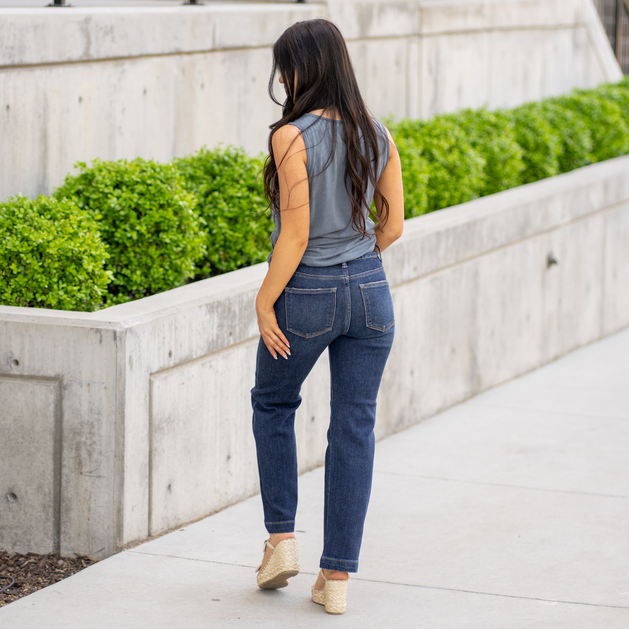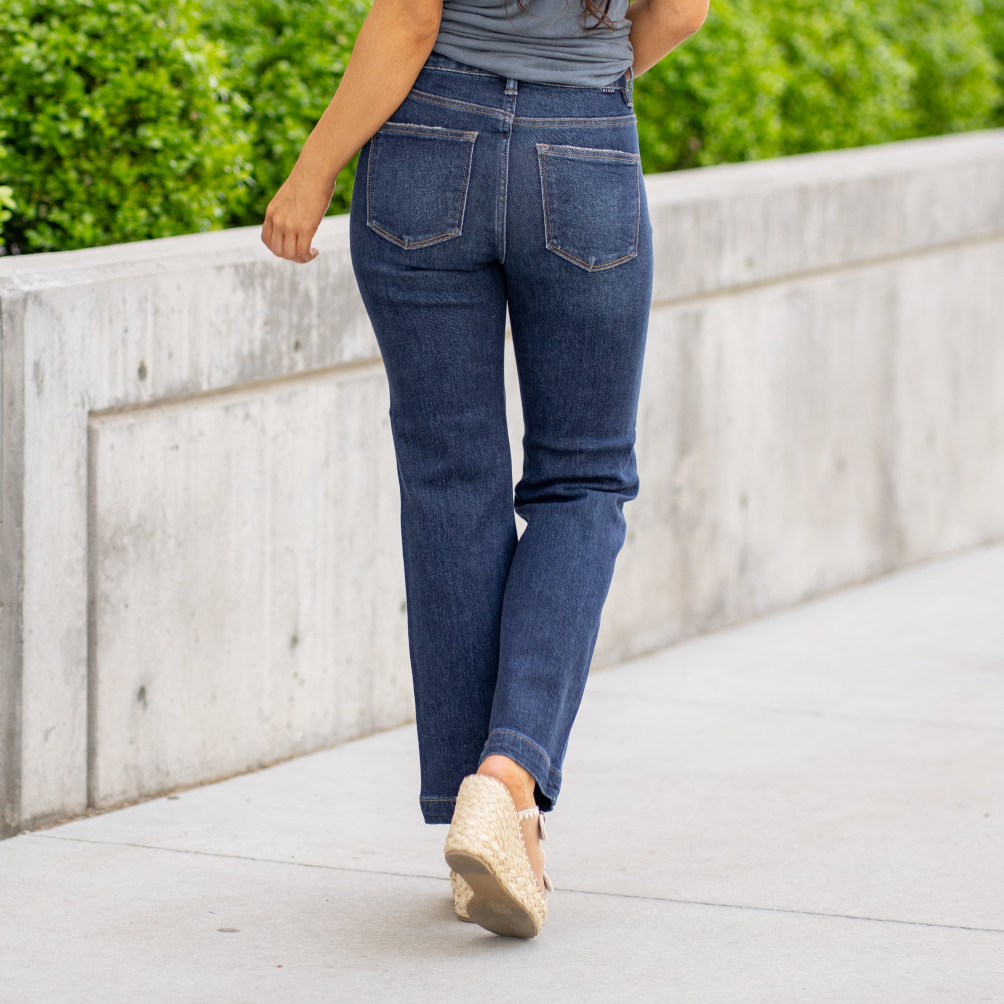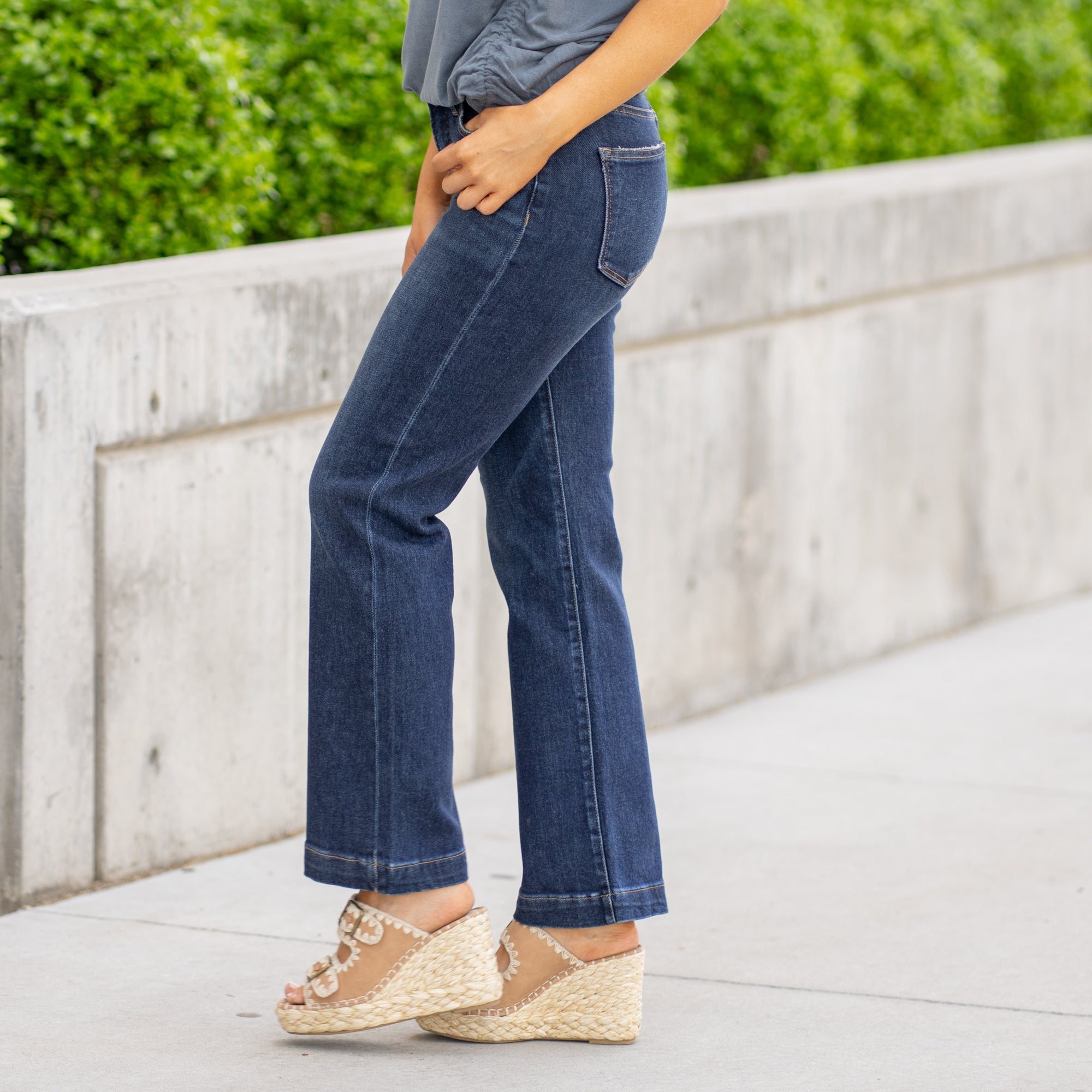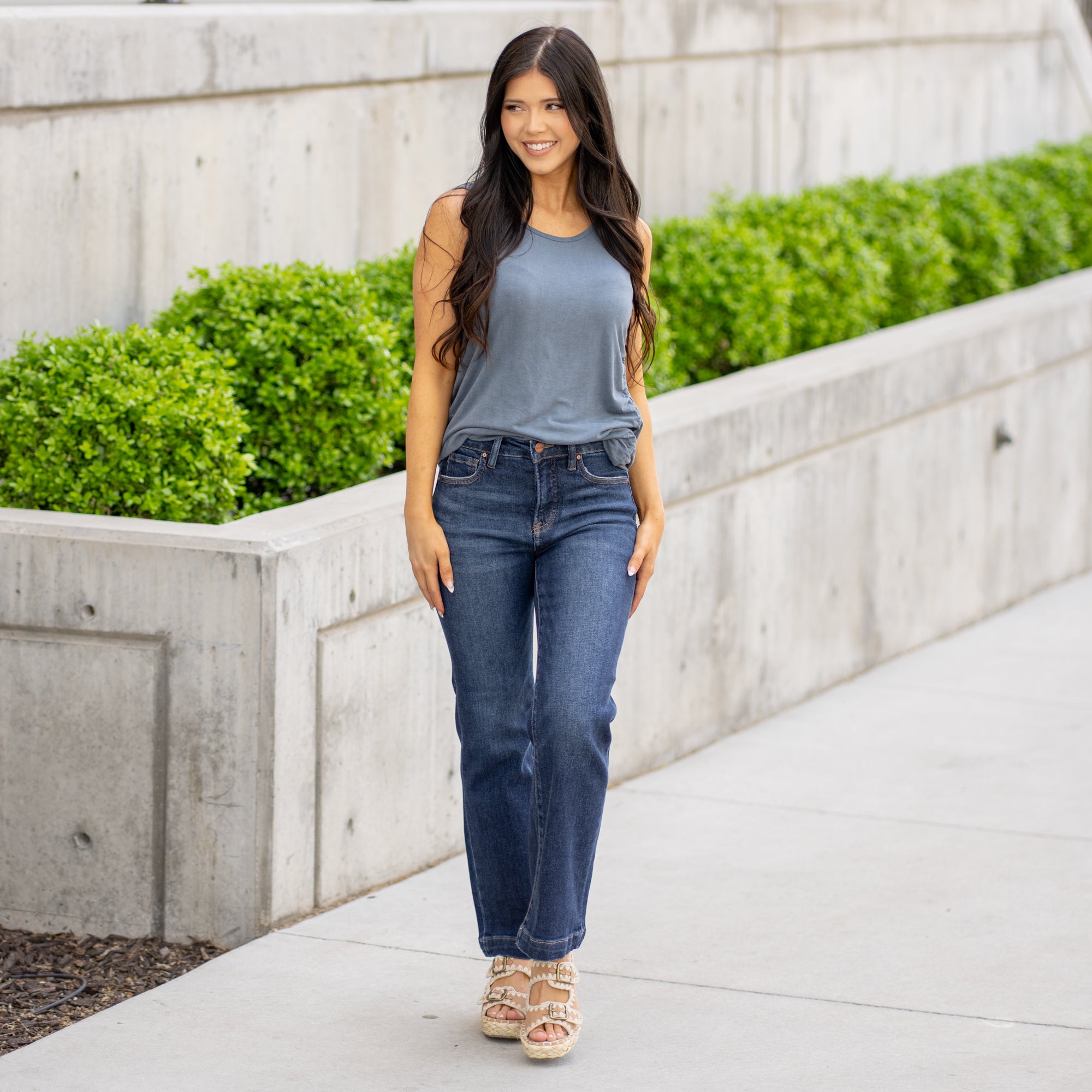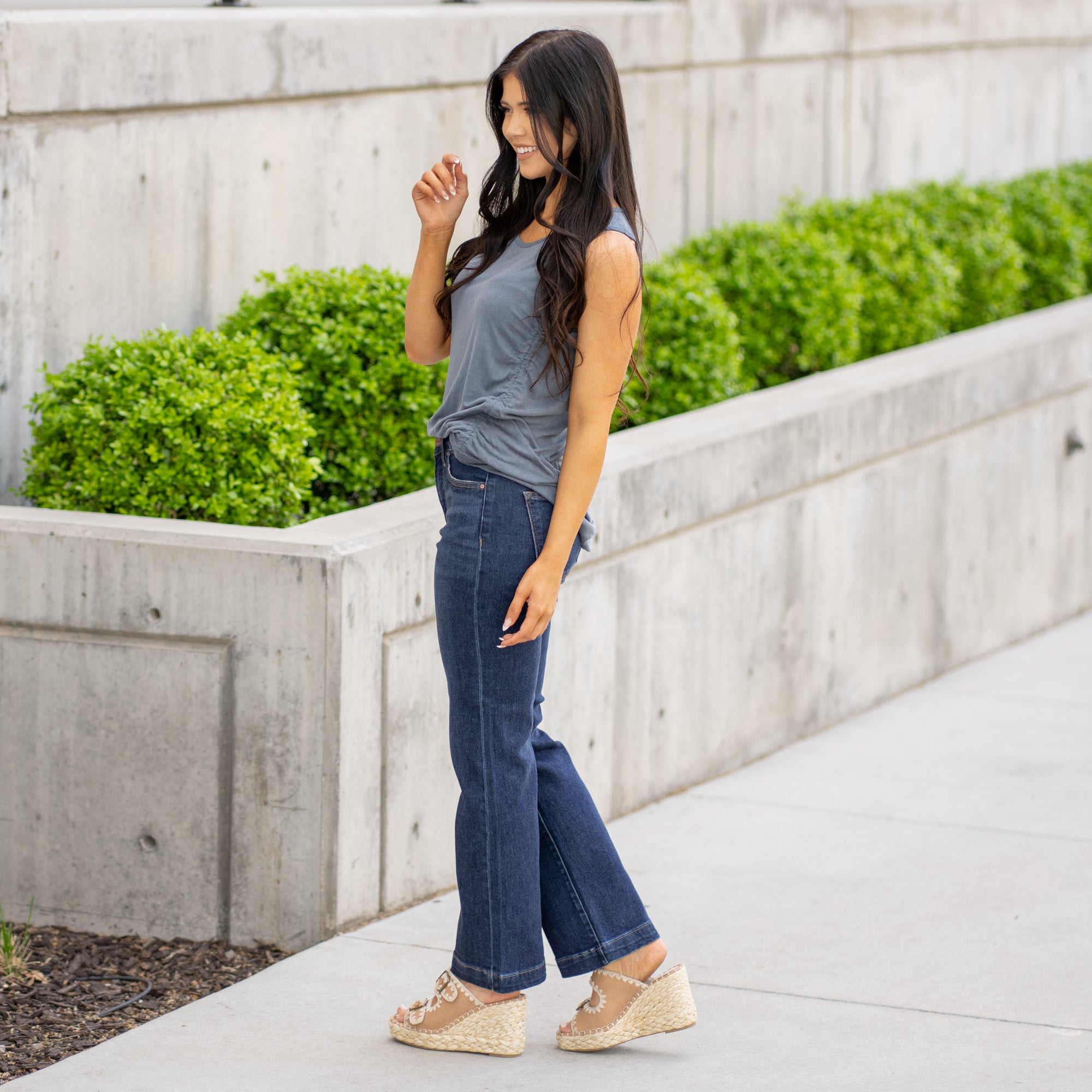 The Sculpt & Stroll Crop Jeans are your go-to for a flattering, feel-good fit. Designed with built-in tummy control and a high rise waist, these jeans hug you in all the right places while offering a roomy, cropped wide leg for breathable movement. Finished in a rich dark wash, they’re polished enough for dressing up and comfy enough for every day. Your denim drawer just found its new favorite.
