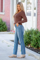 These high-rise slim straight jeans feature comfortable stretch fabric, a classic regular hem, and stylish knee distressing for a fashionable edge. Perfect for those who value both style and comfort in their denim.