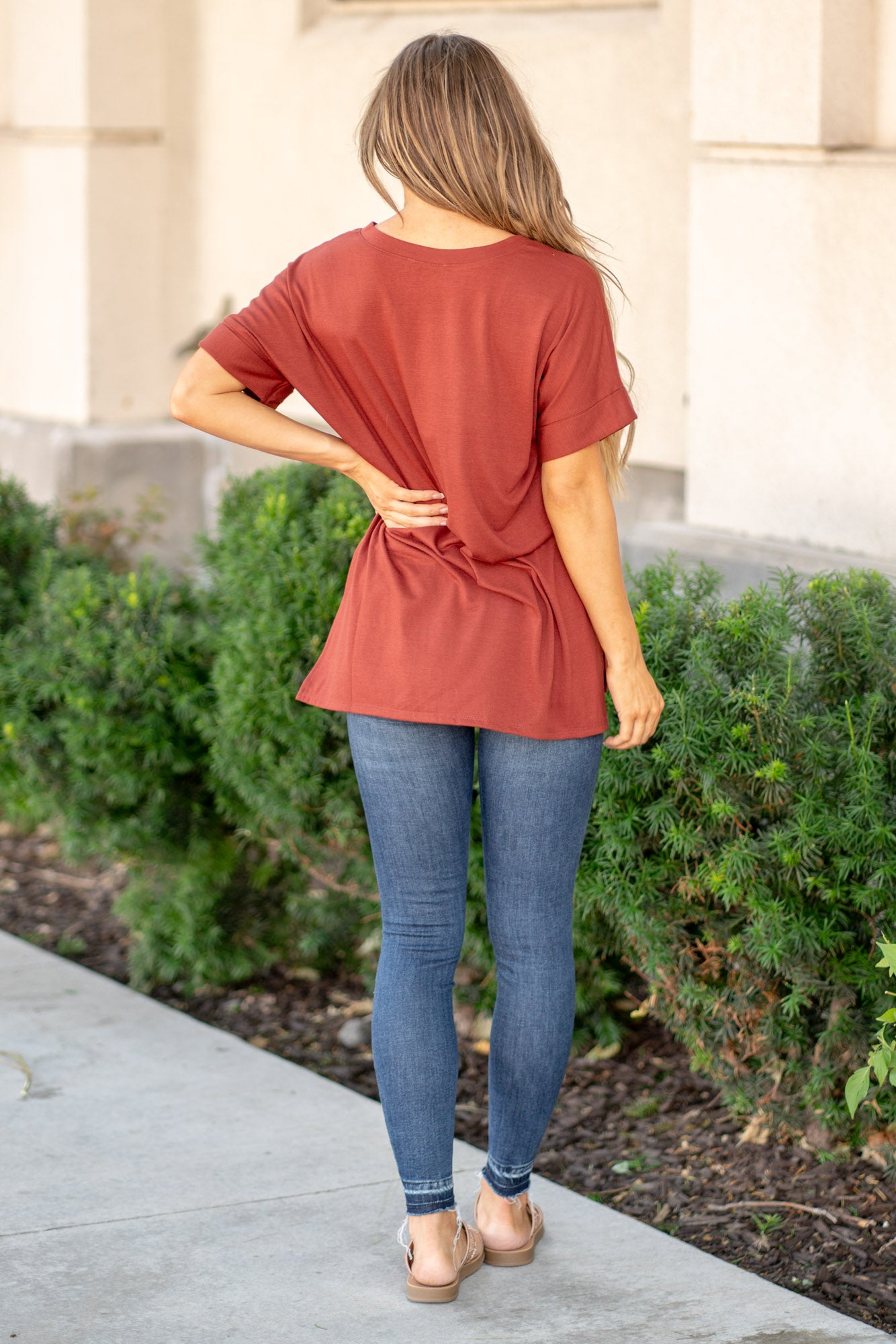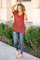 Super Soft High Low Hem V Neck Top - Dark Rust T-Shirt